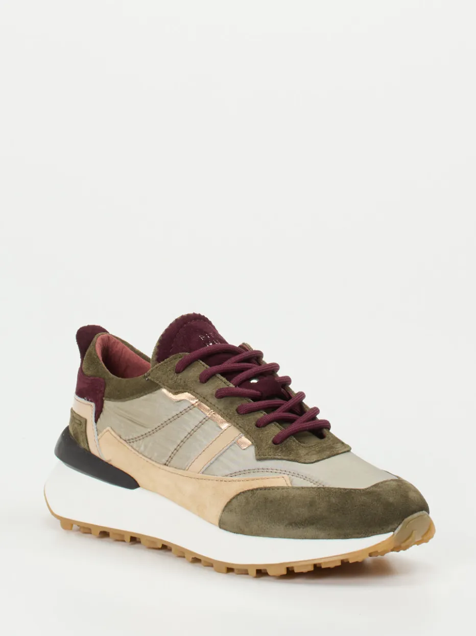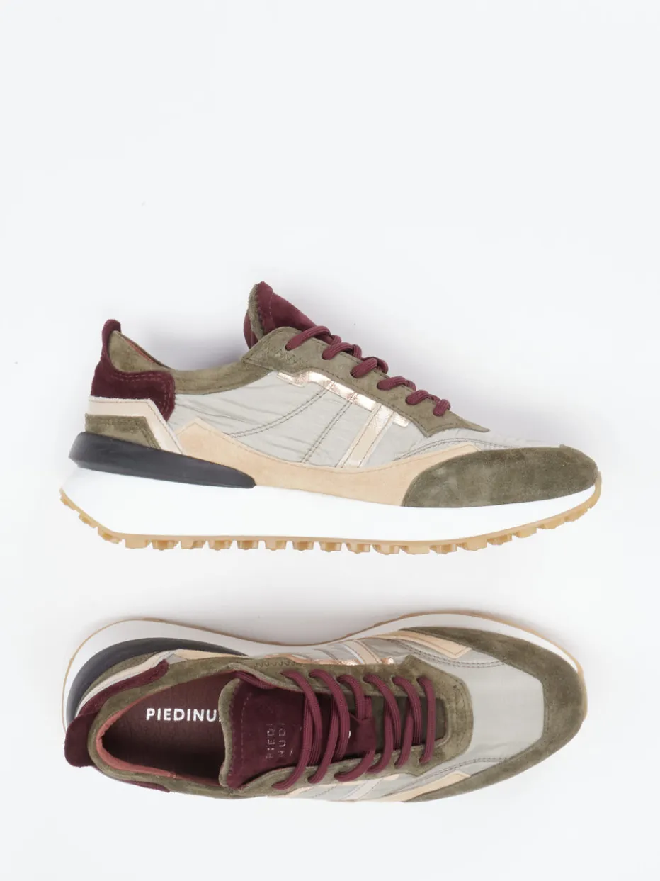 Mit spannender Oliv-Weinrot-Beige-Kombination und Metallic-Details interpretiert Piedi Nudi den Retro-Runner neu – modisch, komfortabel und mit urbanem Profil für sicheren Auftritt.