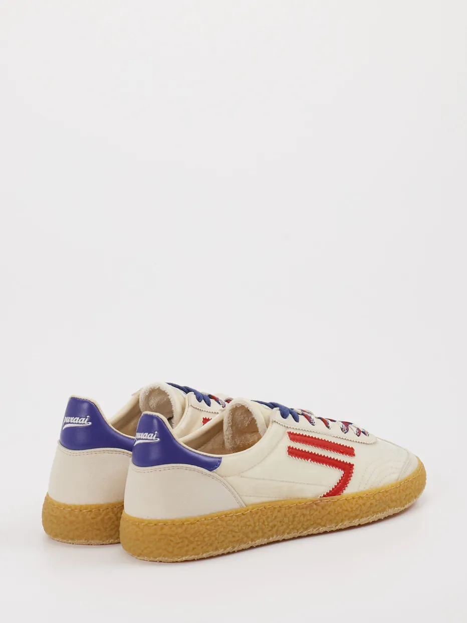 Streetstyle trifft Retro-Athletik. Puraai präsentiert mit diesem Sneaker ein Modell im Vintage-Stil mit sportlicher Note. Ideal für urbane Freizeitlooks bietet der Retro-Sneaker aus Veloursleder und Textil eine matte Oberfläche in Cremeweiß mit kontrastierenden Akzenten in Signalrot und Kobaltblau. Die klassische flache Silhouette wird durch zweifarbige Schnürsenkel, eine farblich abgesetzte Fersenkappe und die geprägte Gummisohle betont. Mit natürlicher Kork-Innensohle versehen, liefert er Komfort und Nachhaltigkeitsaspekte zugleich. Der Look erinnert an die Retro-Football-Ästhetik der 90er und passt ideal zu Trends wie Color-Blocking. Ein Mode-Statement mit charakterstarkem Design und bewusster Materialwahl.