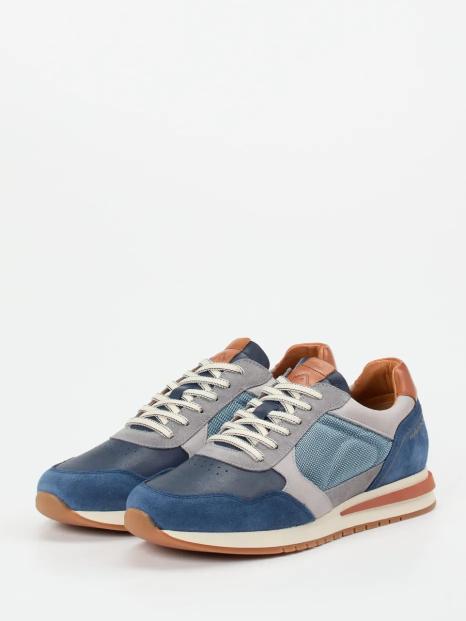 Vielseitiger Retro-Look für entspannte Tage.Ambitious präsentiert diesen Herren-Sneaker im Vintage-Runner-Stil. Für urbane Erkundungstouren oder entspannte Sommertage bietet dieser Sneaker den passenden Komfort. Der hochwertige Materialmix kombiniert weiches Veloursleder mit glattem Kalbleder und strukturiertem Mesh. Jeansblau dominiert die Silhouette, während cognacbraune Details und hellgraue Kontraste stilvolle Akzente setzen. Logo-Prägung seitlich, eine gepolsterte Fersenkappe sowie eine robuste, profilierte Gummisohle sorgen für Funktionalität und sportliche Optik. Retro-Design trifft auf modernen Color-Blocking-Trend. Ambitious vereint Komfort und Retro-Stil mit charakterstarker Farbgestaltung.