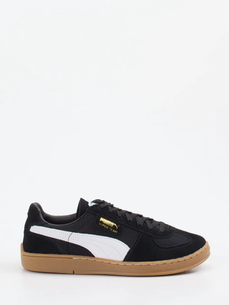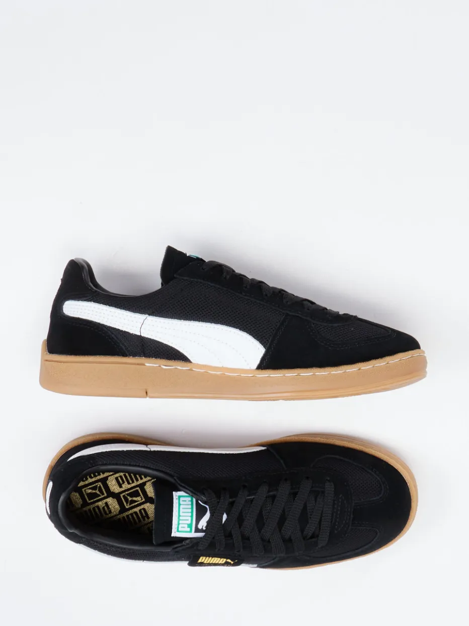 Inspiriert vom Hallensport der 90er.Puma interpretiert den Retro-Sneaker neu: Dieser schwarze Unisex-Schuh kombiniert samtiges Veloursleder mit atmungsaktivem Mesh und einer markanten Gum-Sohle. Ideal für urbanen Alltag und Freizeit bietet das Modell mit flacher Silhouette, sportlicher Schnürung sowie auffälligen Kontraststreifen und goldfarbenem Markenlogo einen authentisch-vintage Look. Die profilierte Gummisohle sorgt für rutschhemmenden Komfort und robusten Halt. Als Streetwear-Highlight perfekt kombinierbar mit Trainingsjacke oder cropped Jeans. Ein Sneaker mit Kultpotenzial – sportiv, trendorientiert und klar im Look von Puma.