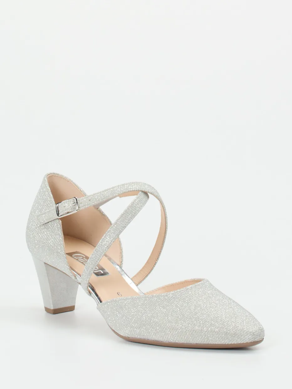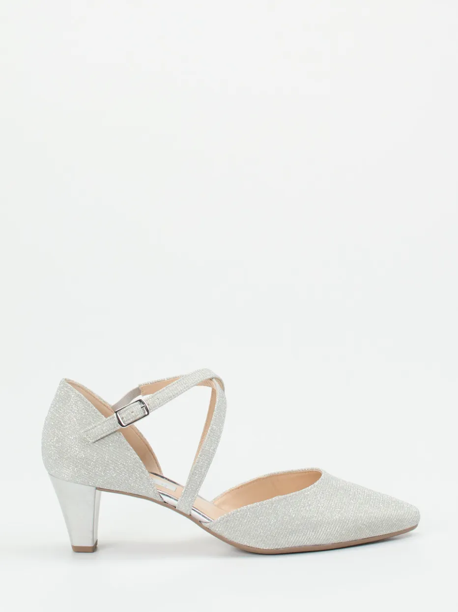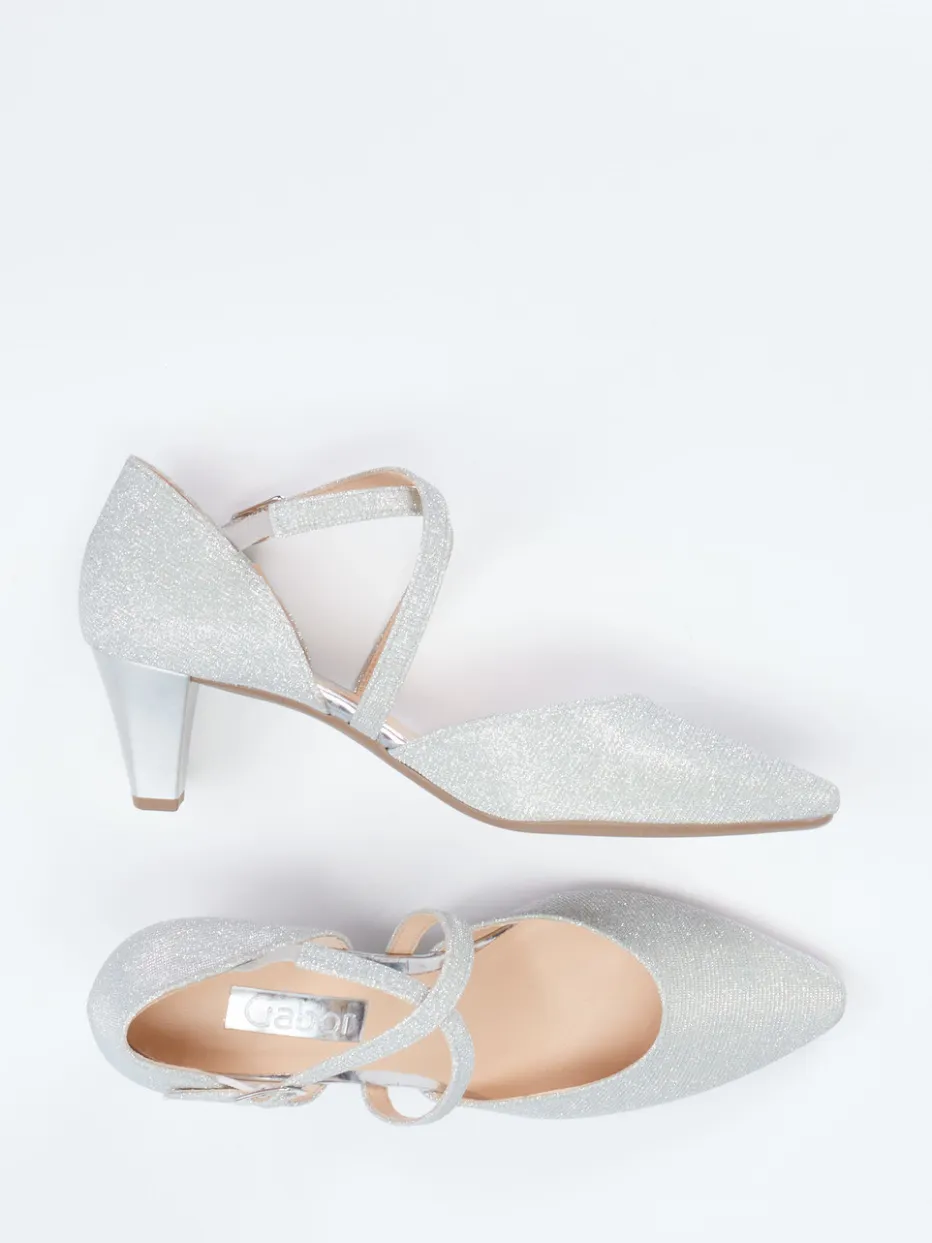 Glanzvoller Auftritt garantiert.Gabor interpretiert klassische Riemchenpumps neu – mit glitzerndem Finish und detailverliebten Akzenten. Ob fürs Standesamt oder die Abendgala: Die silberfarbenen Spangenpumps aus hochwertigem Metallicleder überzeugen mit spitz zulaufender Silhouette, überkreuzten Riemchen mit Metallschließe und einem stabilen Blockabsatz von fünf Zentimetern Höhe. Die leicht profilierte Gummisohle und das softe Fußbett ergänzen funktionalen Komfort. Visuell dominiert eine edle Glitzerstruktur, die modisch in die Trendlinie „Occasionwear Revival“ passt – ein Schuh für Klassikerliebhaberinnen mit Gespür für Stil. Hochwertige Verarbeitung trifft auf elegantes Design – in typischer Gabor-Manier.