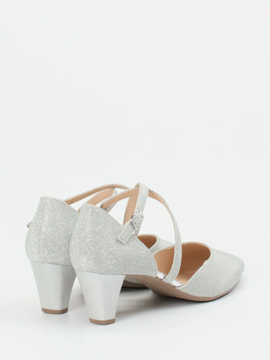 Der klassische Spangenpumps erhält durch glitzerndes Metallicleder und überkreuzte Riemchen ein modernes Update. Der stabile Blockabsatz sorgt für angenehmen Komfort bei besonderen Anlässen.