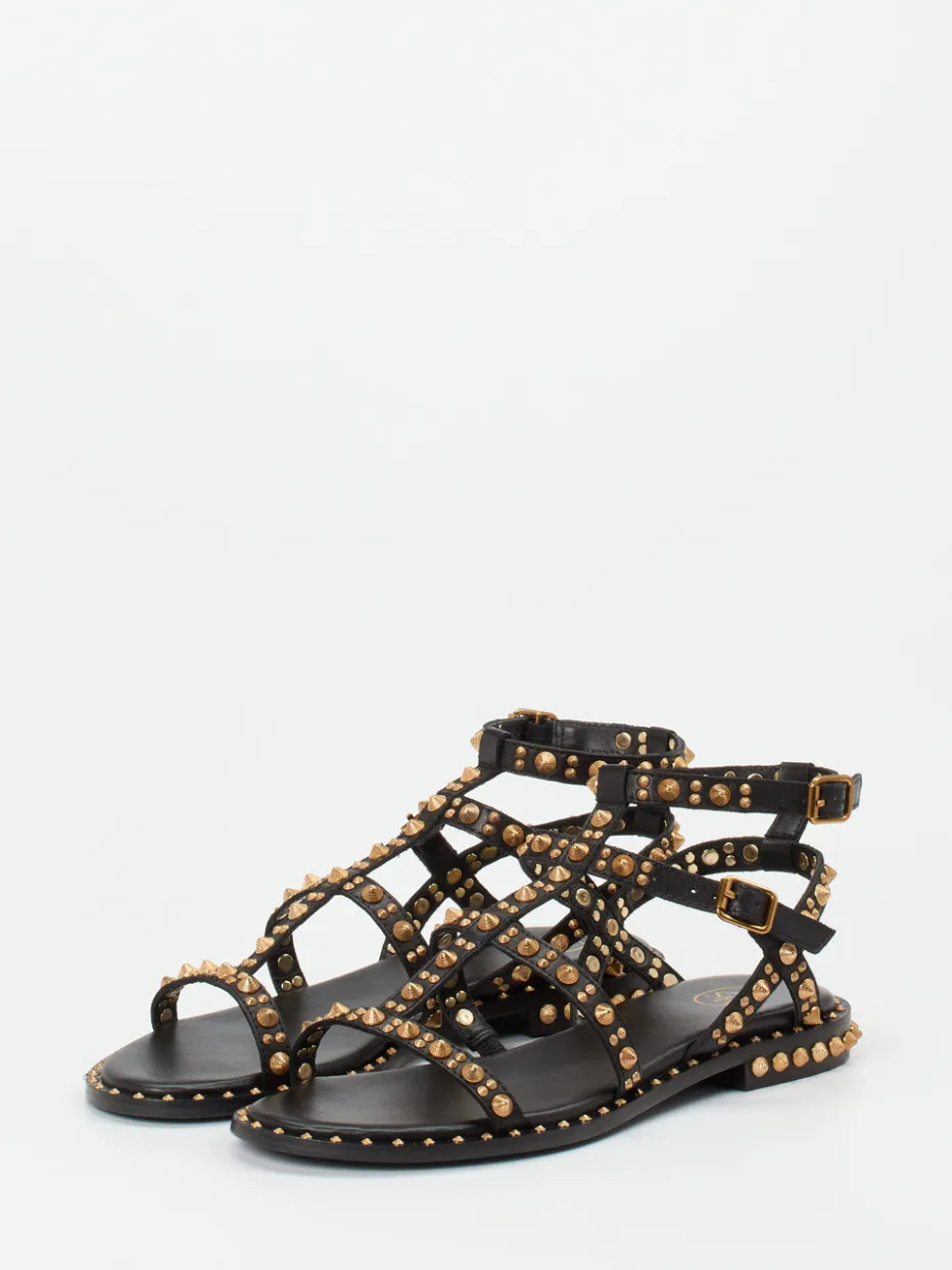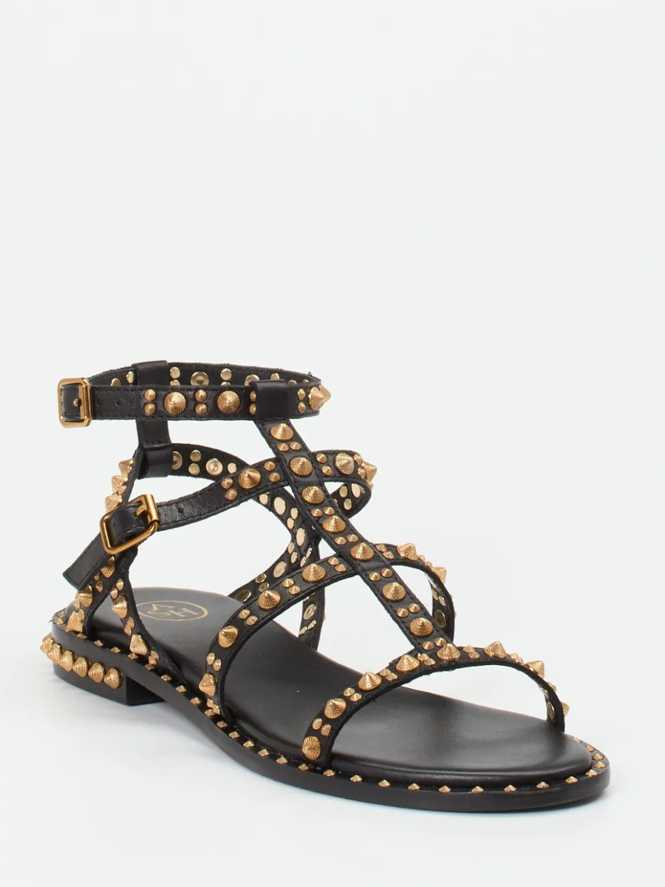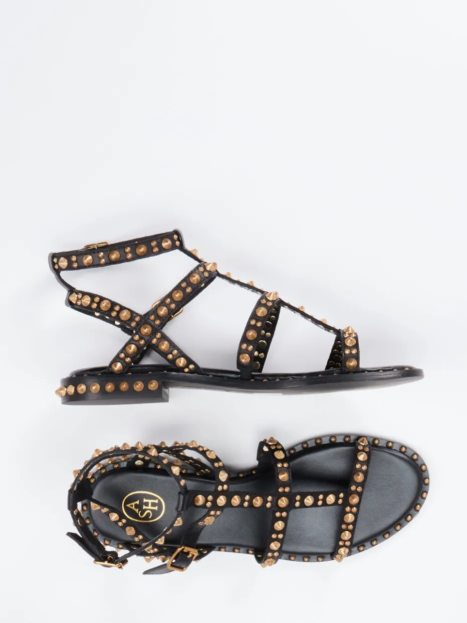 Statement-Sandale für starke Looks.ASH präsentiert mit dieser Damen-Riemchensandale ein markantes Modell im sommerlichen Stil. Ideal für Festivals, Partynächte oder urbane Spaziergänge: Das hochwertige Kalbleder überzeugt durch glatte, matte Oberfläche und eine gepolsterte Innensohle für angenehmen Tragekomfort. Schwarze Silhouette, flache Form und goldfarbene Metallnieten betonen den angesagten Gladiator-Look. Zwei filigrane Schnallenriemen um Spann und Knöchel sorgen für sicheren Halt. Die elegante Ledersohle mit Logo komplettiert den rockig-glamourösen Stil, der sowohl zu Sommerkleid als auch zur Lederclutch passt. Design trifft Komfort – ASH interpretiert urbanen Chic mit handwerklicher Raffinesse.