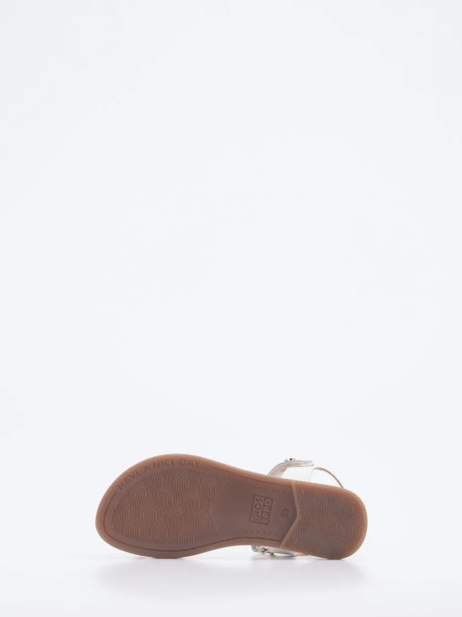 Mit glänzenden Metallic-Blüten und flacher Gummisohle vereint diese Kindersandale stilvolles Design und Tragekomfort. Ideal für warme Tage in Freizeit oder Urlaub.