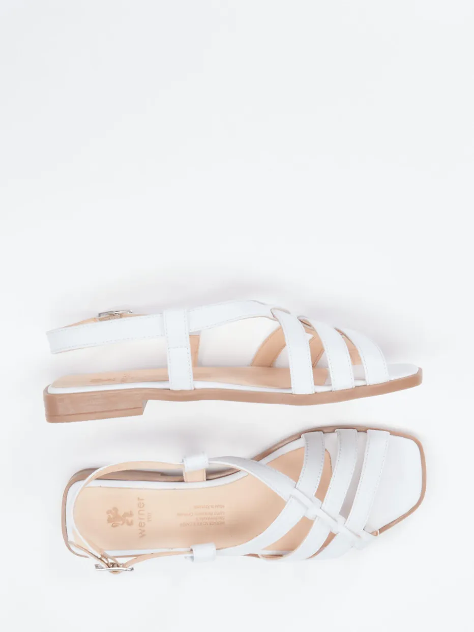 Schlichte Raffinesse für warme Tage.Die Marke Werner präsentiert mit dieser Riemchensandale ein Modell für anspruchsvolle Füße. Ideal bei städtischen Spaziergängen oder entspannten Urlaubstagen überzeugt die Sandale mit chromfrei gegerbtem, pflanzlich behandeltem Kalbleder. In strahlendem Weiß gehalten, verleiht das matt strukturierte Leder einen modernen, klaren Look. Die offenen Riemen mit silberfarbener Schnalle betonen die quadratische Zehenpartie und schaffen subtile Vintage-Anklänge. Eine flexible Gummisohle sowie das lederbezogene Fußbett sorgen für angenehmen Komfort. Modisch im Zeichen des Quiet Luxury-Trends lässt sich dieses Modell perfekt zu Leinenkleid oder Ton-in-Ton-Looks kombinieren. Luftiger Begleiter mit handwerklicher Verantwortung und Alltagstauglichkeit.