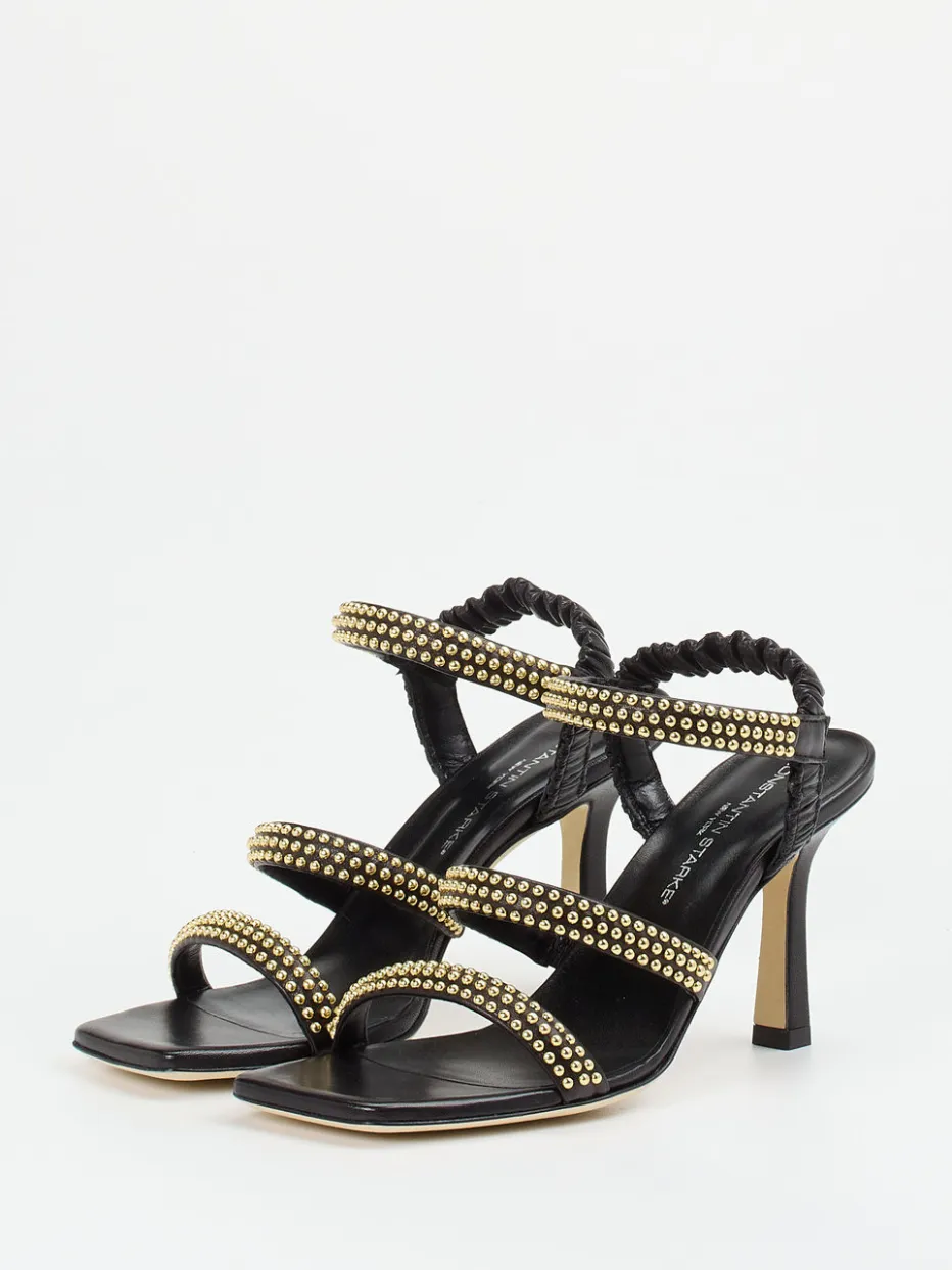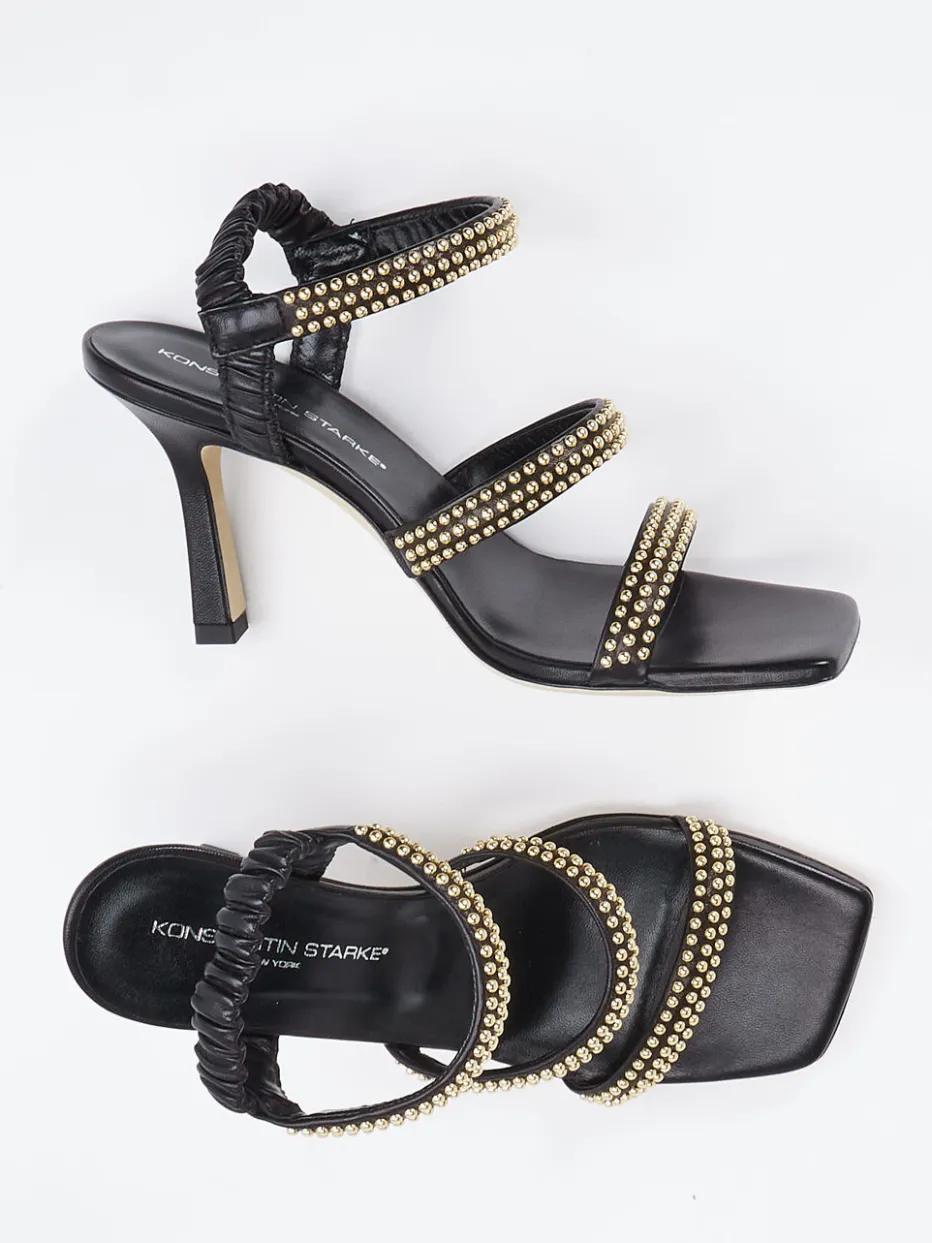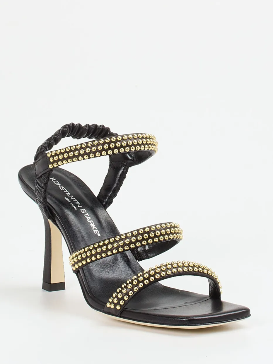 Glamour trifft auf architektonische Linie.Die Marke Konstantin Starke präsentiert mit dieser Sandalette ein ausdrucksstarkes Damenmodell für festliche Anlässe. Ob beim feierlichen Empfang oder einem stilvollen Abend-Event – das weiche, schwarze Lammleder mit glänzendem Finish wird durch goldene Nieten elegant akzentuiert. Die offene Silhouette mit eckiger Zehenpartie liegt voll im Square-Toe-Trend, ergänzt durch einen leicht geschwungenen Absatz mit acht Zentimetern Höhe. Raffiniert geraffter Fersenriemen und die weiche Ledersohle sorgen für Komfort und sicheren Stand. Stilistisch inspiriert vom Y2K-Revival mit einem Hauch von Minimalismus, passt diese Partysandale ideal zu Metallic-Accessoires. Konstantin Starke steht hier für handwerkliche Veredelung im Zeichen femininer Ausdruckskraft.