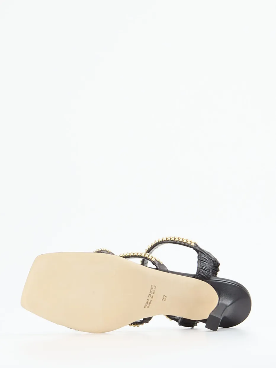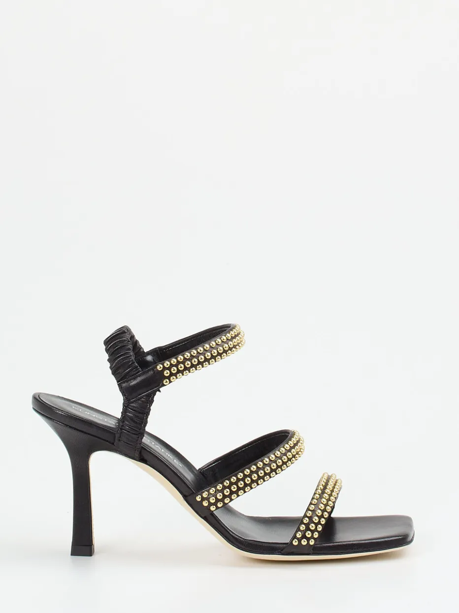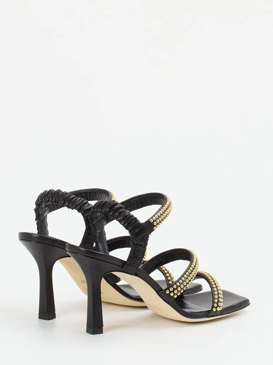 Die Kombination aus weichem Lammleder, glänzender Oberfläche und goldfarbenen Nieten macht diese Sandalette zu einem stilvoll-expressiven Highlight für gehobene Abendanlässe.