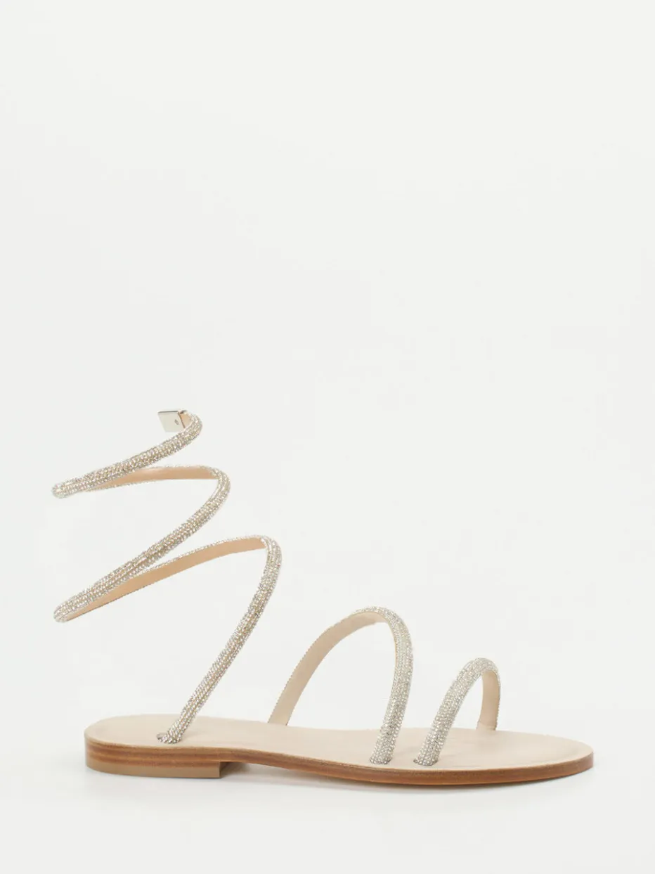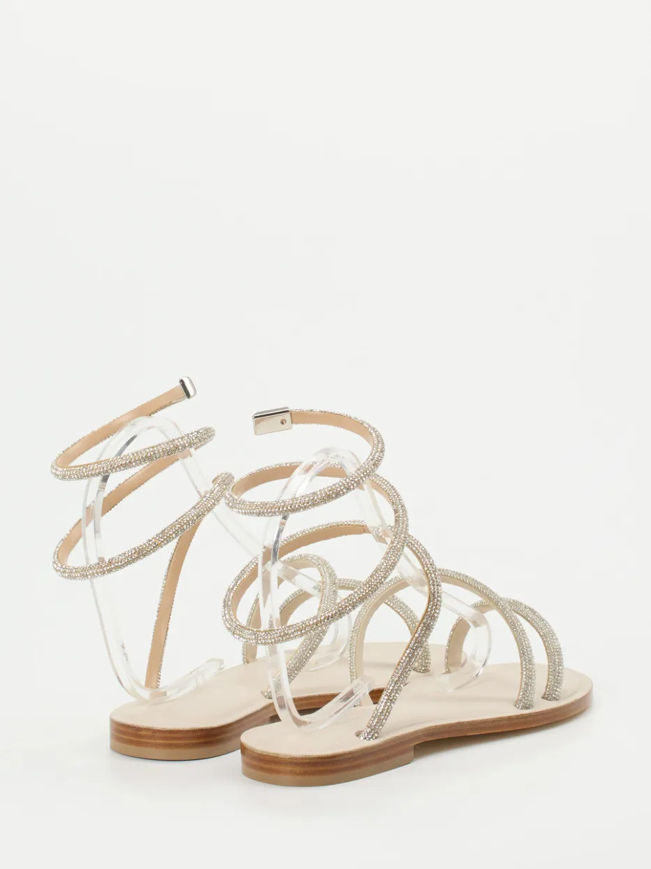 Die sandfarbene Riemchensandale kombiniert filigrane Strassdetails mit moderner Wickeloptik. Ein fashion-forward Akzent für festliche Sommerlooks.