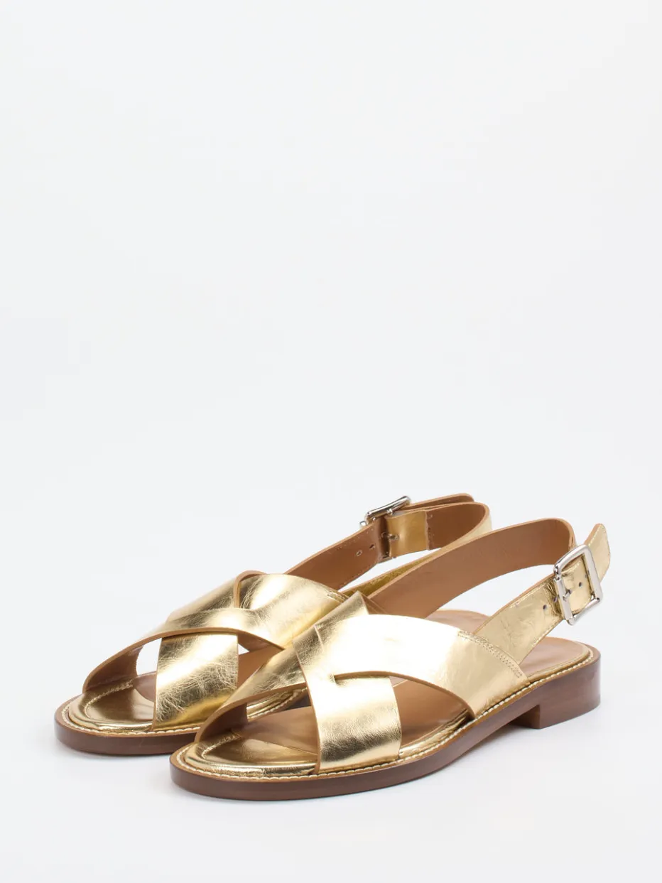 Für Spaziergänge in der Stadt oder entspannte Urlaubstage bietet das hochwertig verarbeitete Metallicleder mit leicht gekörnter Oberfläche und goldfarbenem Glanz exzellenten Stil. Das offene Design mit breiten Kreuzriemen und verstellbarem Fersenriemen sorgt für eine luftige Passform, während die gepolsterte Decksohle Komfort bietet. Eine silberfarbene Schnalle sowie der mit heller Ziernaht betonte Rahmen setzen feine Akzente. Der flache Blockabsatz mit Ledersohle in Holzoptik unterstreicht die moderne Retro-Silhouette. Ideal zu Leinenkleid oder Culottes.