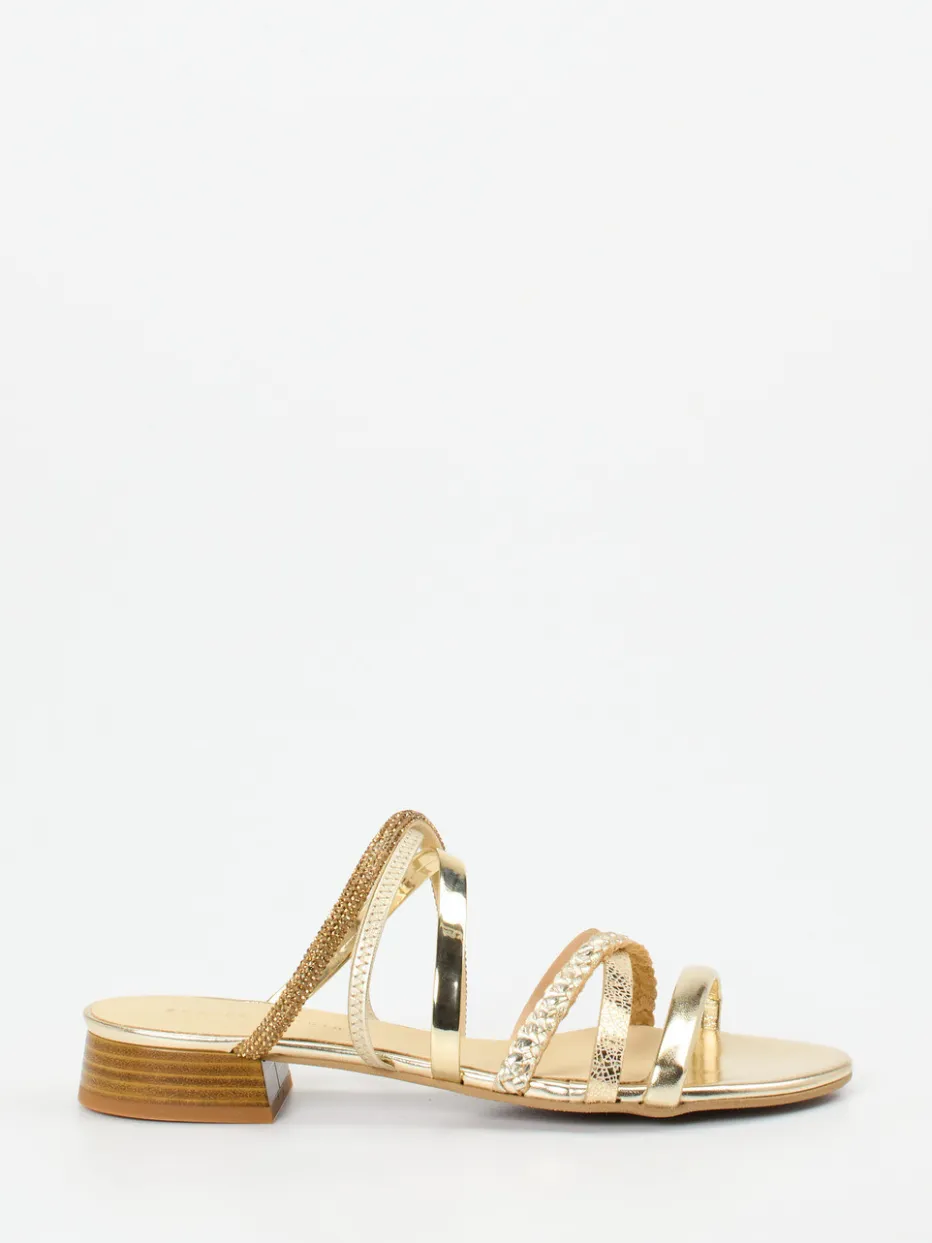 Glanzmoment für festliche Auftritte.Andrea Puccini präsentiert mit dieser Sandale ein elegantes Highlight für besondere Anlässe. Wenn ein stilvoller Sommerabend oder eine festliche Einladung ruft, erfüllt diese goldfarbene Riemchensandale ästhetische und funktionale Ansprüche zugleich. Gefertigt aus edlem Metallicleder mit glitzerndem Textilbesatz und geflochtenem Riemen-Detail, bringt sie eine glänzende Note in jedes Outfit. Die offene Silhouette mit praktischem Slip-On-Einstieg, gepolstertem Fußbett und gummierter Sohle verspricht alltagstauglichen Komfort, während der dezente Blockabsatz für eine feminine Haltung sorgt. Modisch im Einklang mit den Trends „Quiet Luxury“ und „Metallic Accents SS24“. Ein raffinierter Begleiter mit glamourösem Markencharakter.
