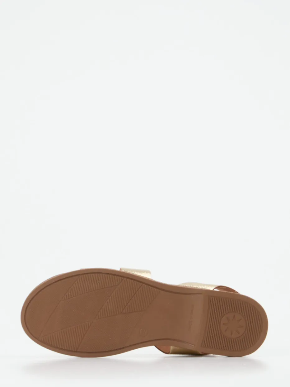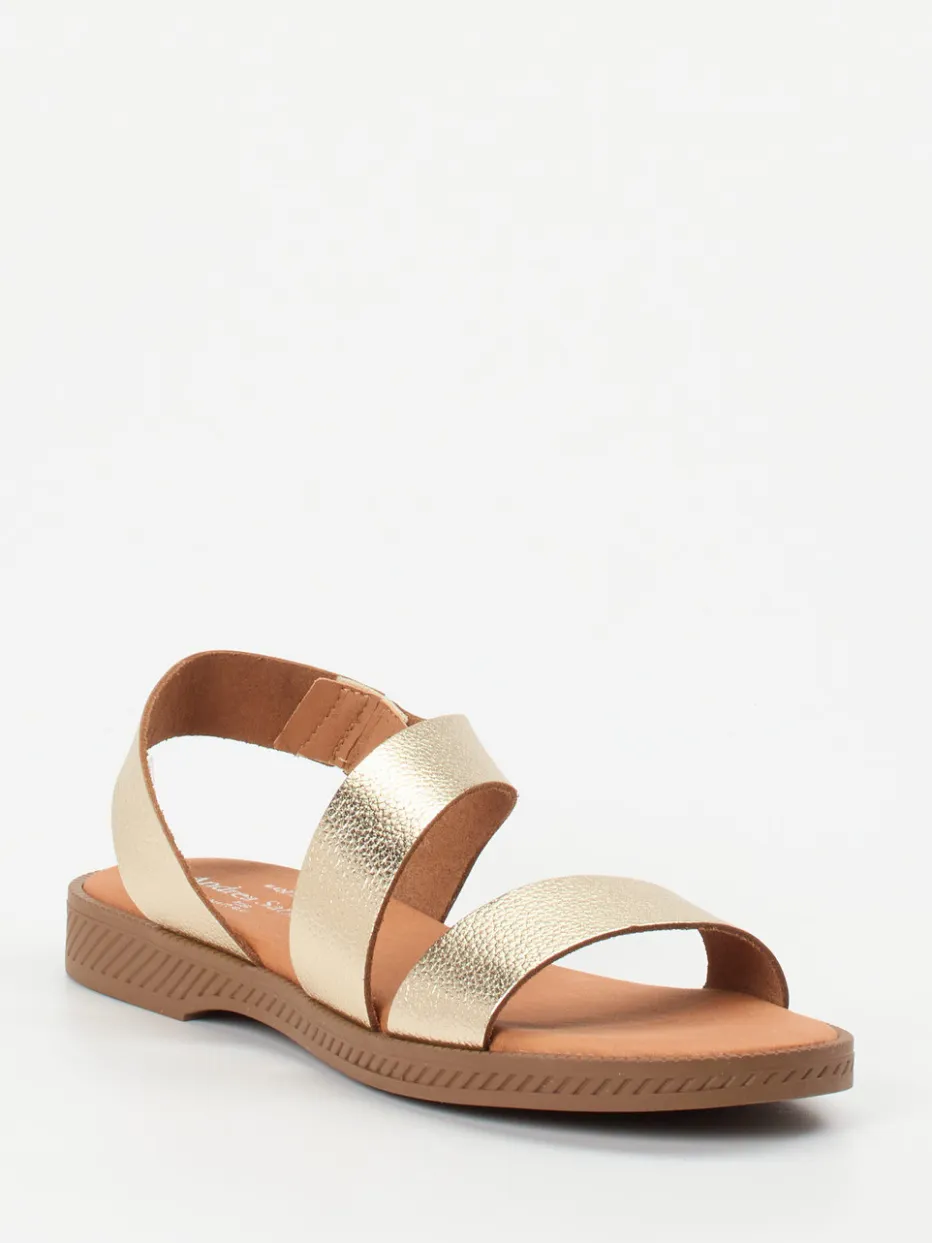Die elegante Riemchensandale kombiniert glänzendes Metallicleder mit einem elastischen Fersenriemen und sorgt so für sommerlichen Komfort mit modischer Leichtigkeit.
