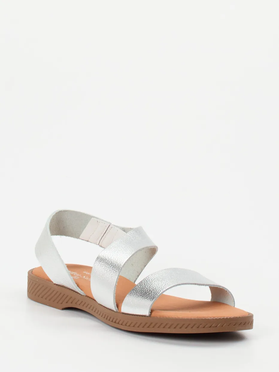 Ideal für warme Tage, punktet dieses Modell durch feines, silberfarbenes Metallicleder mit genarbter Oberfläche. Die offene, flach gehaltene Form mit elastischem Fersenriemen erleichtert den Einstieg, während eine profilierte Gummisohle rutschhemmenden Komfort im Alltag bietet. Sichtbare Nähte und ein schimmerndes Finish greifen den Trend „Metallic Accents SS24“ auf und ergänzen minimalistische Sommer-Looks perfekt. Harmoniert besonders mit luftigen Leinenkleidern oder naturfarbenen Accessoires.