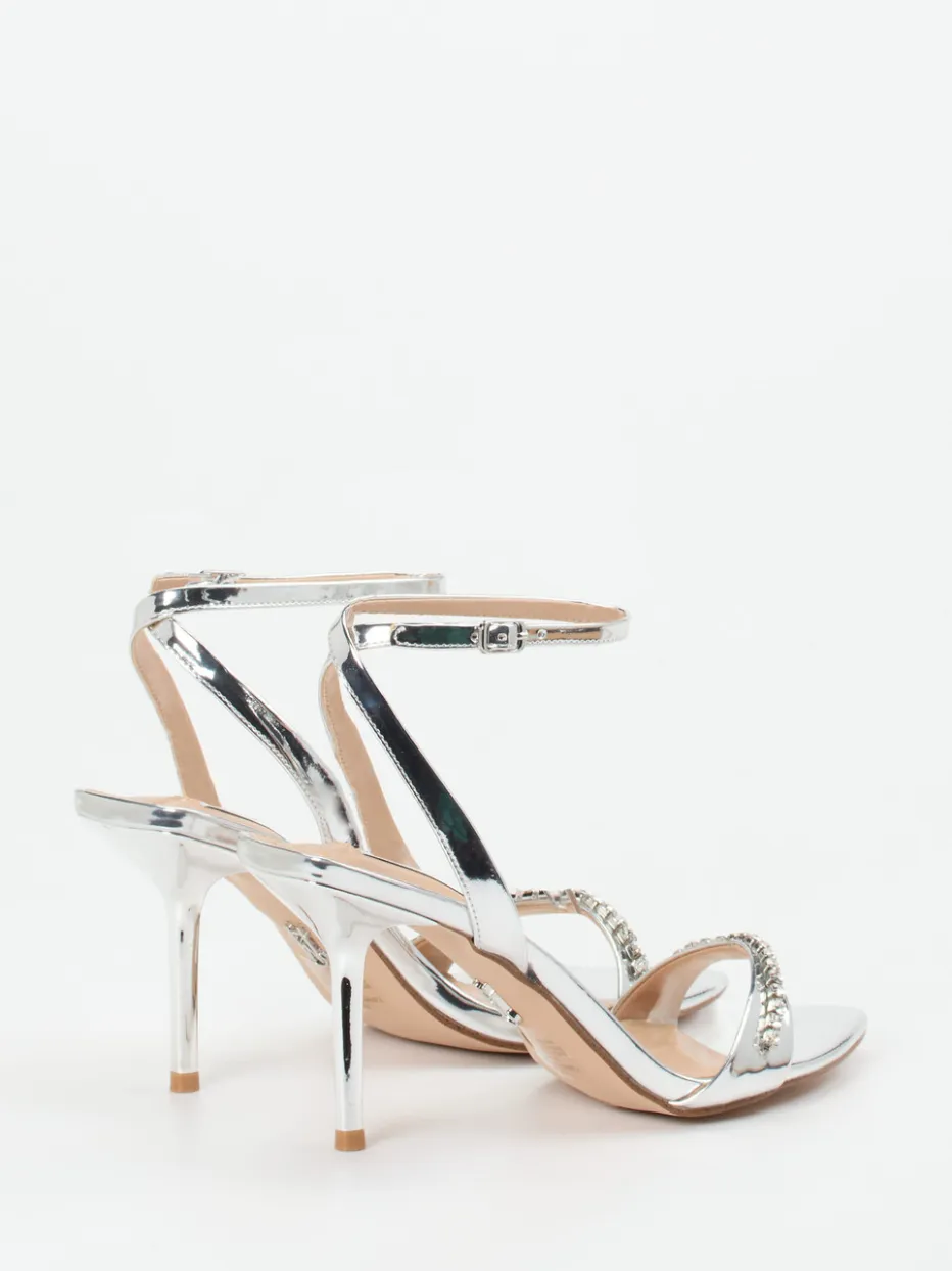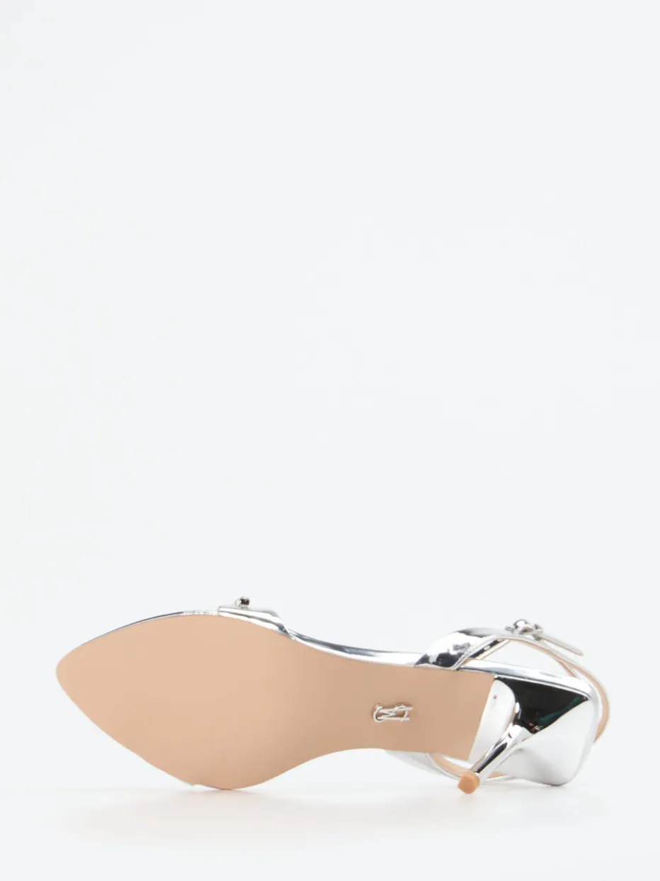 Diese silberfarbene Sandalette verbindet filigranes Design mit schimmerndem Metallicleder und funkelnder Strassverzierung – eine elegante Symbiose für glamouröse Auftritte.