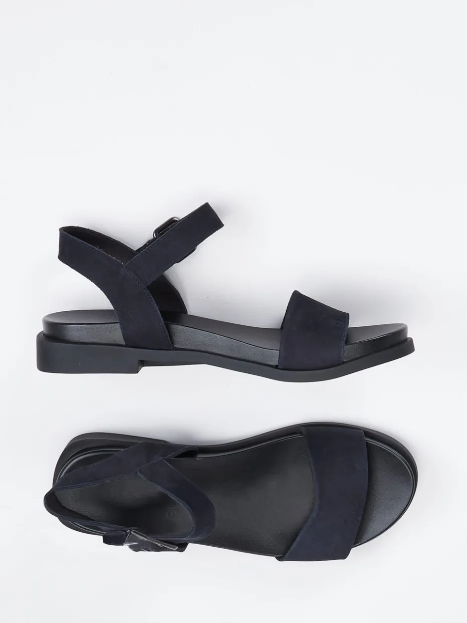 Stilvoll durch den Sommer.Die Riemchensandale von Arche bringt französisches Understatement in die Kategorie komfortabler Sommerschuhe. Perfekt für warme Tage im Alltag oder auf Reisen bietet das Modell aus samtig angeschliffenem Nubukleder in Dunkelblau einen hohen Tragekomfort. Überkreuzte Vorderfußriemen und ein verstellbarer Knöchelriemen mit silberfarbener Metallschnalle unterstreichen das minimalistische Design. Die flache, schwarze Gummisohle mit gepolstertem Fußbett sorgt für ein angenehmes Laufgefühl und stabile Trittsicherheit. Inspiriert vom Quiet-Luxury-Trend der Saison, lässt sich dieser Look mühelos mit Leinenhosen oder sommerlichen Kleidern kombinieren. Ein Arche-Modell für zeitgemäßen Komfort mit ästhetischem Anspruch.