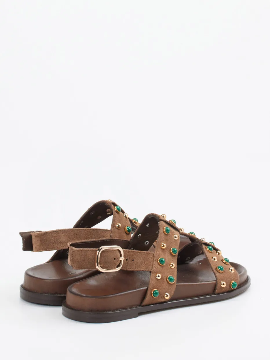 Boho-Glamour neu interpretiert.Andrea Sabatini präsentiert eine Riemchensandale für Damen, die mit charakteristischer Detailverliebtheit besticht. Für warme Tage geschaffen, kombiniert das Modell weiches Veloursleder in Mittelbraun mit einem raffinierten Besatz aus goldfarbenen Rundnieten und smaragdgrünen Inlays. Die offene Silhouette mit flacher Gummisohle und verstellbarem Fersenriemen steht für sommerliche Leichtigkeit und Alltagstauglichkeit. Der lederbezogene Innenbereich ergänzt das angenehme Tragegefühl. Stilistisch verortet sich die Sandale im Boho-Trend und verleiht Freizeit- und Urlaubslooks ein modisches Statement. Kombiniert mit Leinen oder Bast entsteht ein harmonisches Sommeroutfit. Ein Designhighlight mit hohem Anspruch an Komfort und Ausdrucksstärke.
