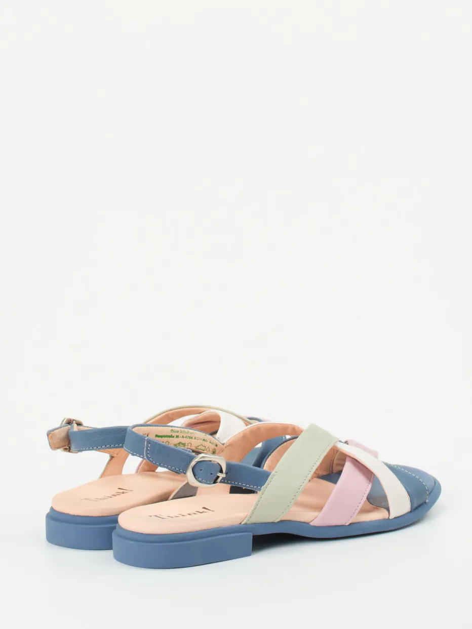 Frischer Minimalismus trifft sanfte Farbtöne.Think präsentiert diese flache Damen-Riemchensandale in hochwertigem, vegetabil gegerbtem Kalbleder. Ideal für warme Tage in der Stadt oder an der Küste: Das matt strukturierte Leder zeigt sich in einer harmonischen Kombination aus Jeansblau, Cremeweiß, Rosé und Salbeigrün. Gekreuzte Vorderiemen, ein verstellbarer Fersenriemen mit goldfarbener Schnalle und feine Kontrastnähte unterstreichen das minimalistische Design. Die profilierte Gummisohle mit ergonomischem Fußbett sorgt für zuverlässigen Tragekomfort im Alltag. Styling-Tipp: passt perfekt zu sommerlichen Kleidern und Crossbody-Bags in soften Tönen. Think-Komfort in frischer Retro-Ästhetik – für entspannte Sommerstunden.
