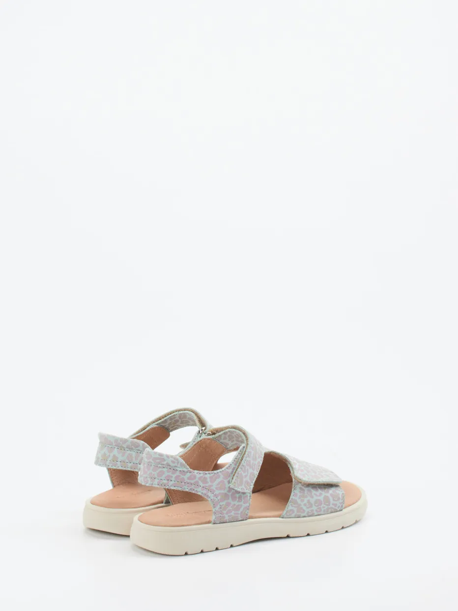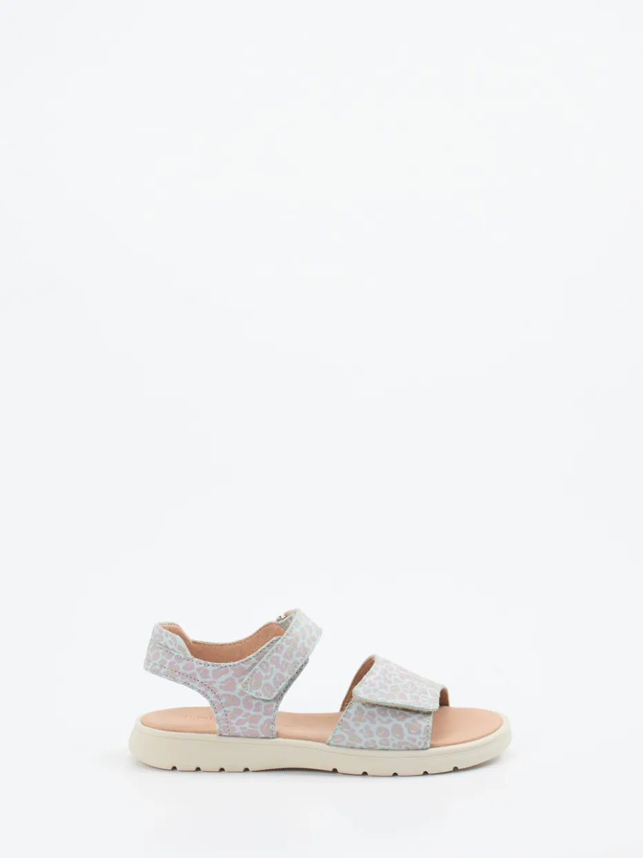 Diese Mädchensandale vereint geprägtes Leder in sanften Pastelltönen mit kindgerechtem Komfort – ideal für warme Tage im Alltag und auf Reisen.