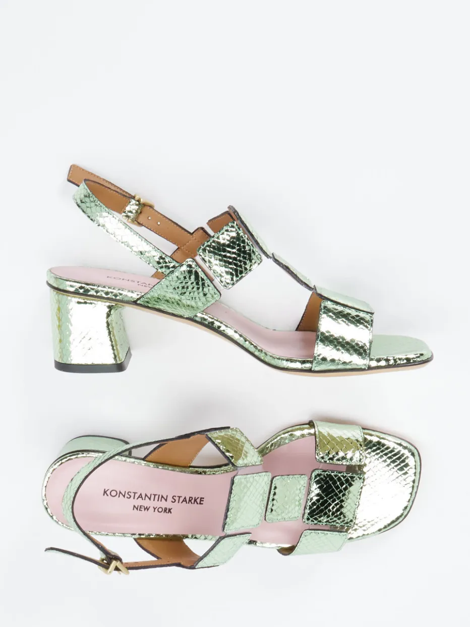 Die Statement-Sandale vereint Metallic-Minzgrün mit schimmernder Schlangenprägung und wirkt stilbildend für moderne Sommer-Looks. Ihr Blockabsatz sorgt für Komfort und modische Präsenz zugleich.