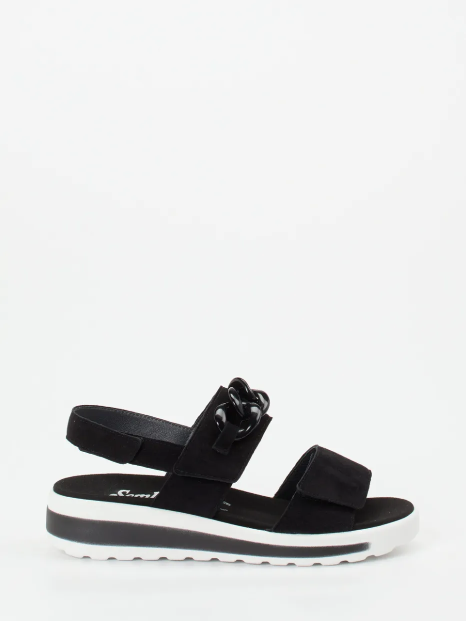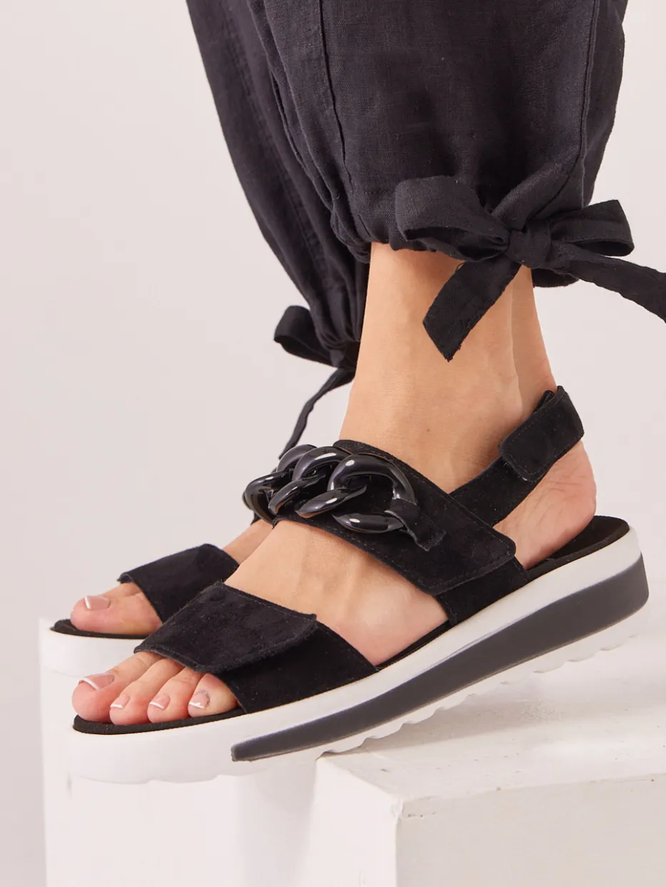 Diese Semler-Sandale kombiniert samtiges Veloursleder mit einem auffälligen Kettendetail und vereint modischen Anspruch mit orthopädischem Komfort.