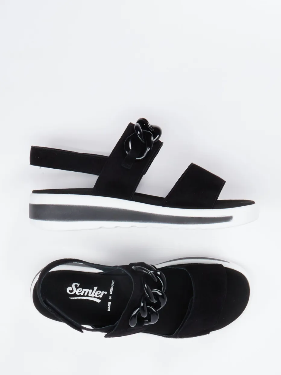 Schwarz-weißer Sommerkomfort.Die Marke Semler präsentiert eine komfortorientierte Sandale für Damen. Ideal für warme Tage mit langen Strecken: Die offene Form, das angenehm weiche Fußbett und die bequeme Weite H unterstützen ermüdungsfreies Gehen. Das schwarze Veloursleder zeigt sich mit matter Oberfläche elegant zurückhaltend, während die tonige Kunststoffkette und die kontrastreiche Luftpolstersohle modische Akzente setzen. Zwei praktische Klettverschlüsse sorgen für optimale Weitenregulierung. Der leicht keilförmige Aufbau bietet sicheren Halt und entspricht dem Trend der „Chunky Sandals“ in monochromem Stil. Kombinierbar zu Leinenhosen oder sportiven Kleidern. Semler steht für stilvolle Bequemschuhe mit wechselbarem Fußbett und liebevollen Details.