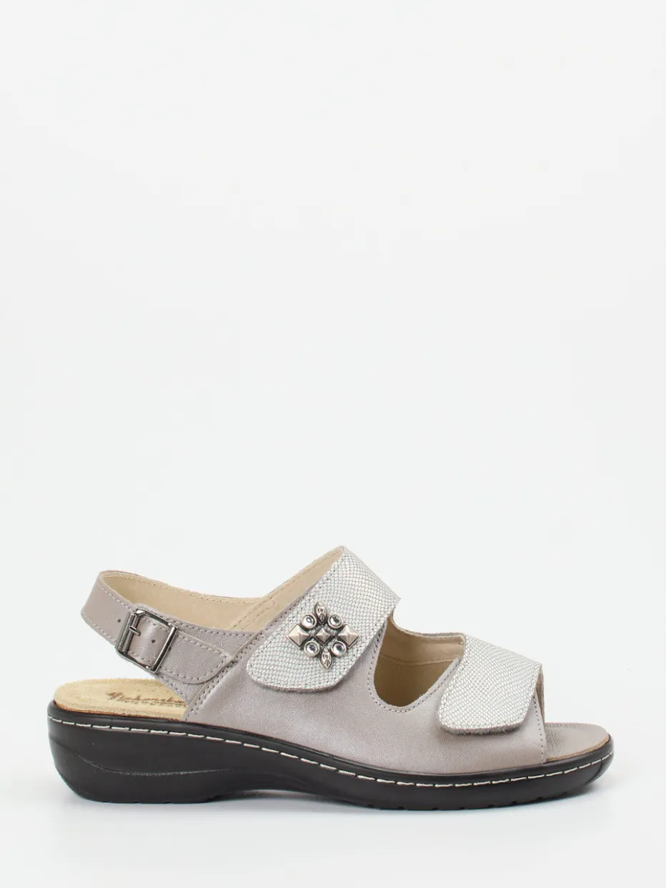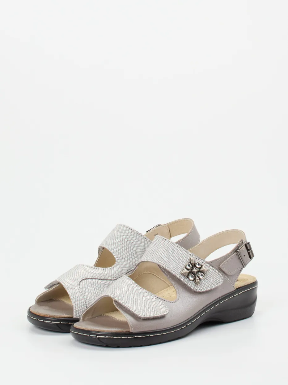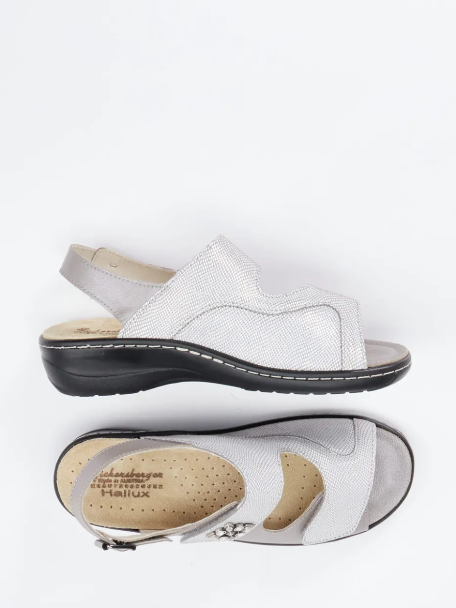 Eleganz und Entspannung im Einklang.Die Marke Hickersberger präsentiert eine graue Komfortsandale für Damen. Ideal für Alltag und Freizeit, sorgt dieses Modell für spürbaren Komfort – auch bei Hallux valgus. Das geprägte Leder mit leicht glänzender Oberfläche zeigt einen dezenten Reptil-Effekt in Silbergrau. Zwei Klettverschlüsse und ein verstellbarer Fersenriemen ermöglichen individuelle Anpassung, während das herausnehmbare, lederbezogene Korkfußbett orthopädische Nutzung unterstützt. Eine schwarze PU-Sohle mit rutschhemmendem Profil und Schockabsorber bietet Trittsicherheit und Dämpfung. Die offene, ergonomische Form fügt sich in ein komfortorientiertes, minimalistisch inspiriertes Design. Hickersberger steht für funktionale Passform kombiniert mit unaufdringlichem Chic.