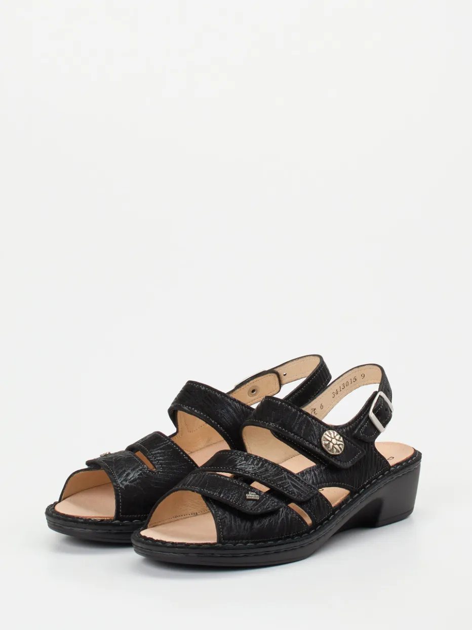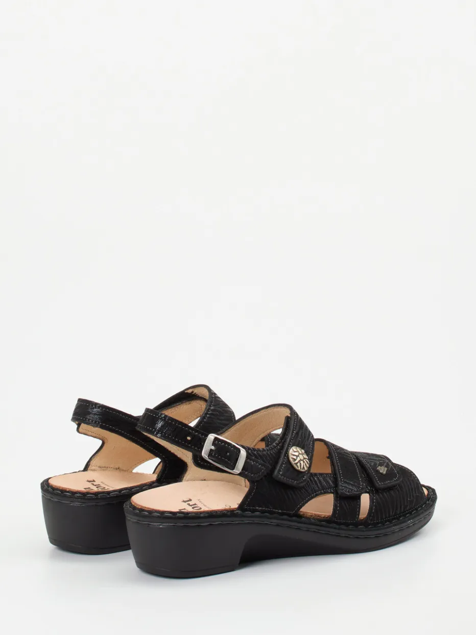 Trägt entspannt durch warme Tage.Finn Comfort präsentiert mit dieser Damen-Sandalette ein ausgereiftes Komfortmodell für Alltag und Freizeit. Das geprägte Leder in Schwarz verleiht dem offenen Design mit Fersenriemen und Zierknopf eine strukturierte, edel-glänzende Oberfläche. Drei verstellbare Klettverschlüsse sorgen für individuelle Passform, das lederbezogene Korkfußbett lässt sich bequem austauschen. Die stoßdämpfende PU-Sohle bietet angenehm leichten Halt. Angelehnt an den „Quiet Luxury“-Trend trifft funktionale Gestaltung auf zurückhaltende Ästhetik – ideal für komfortaffine Trägerinnen. Ergonomischer Komfort mit hochwertigem Material in handwerklicher Verarbeitung.