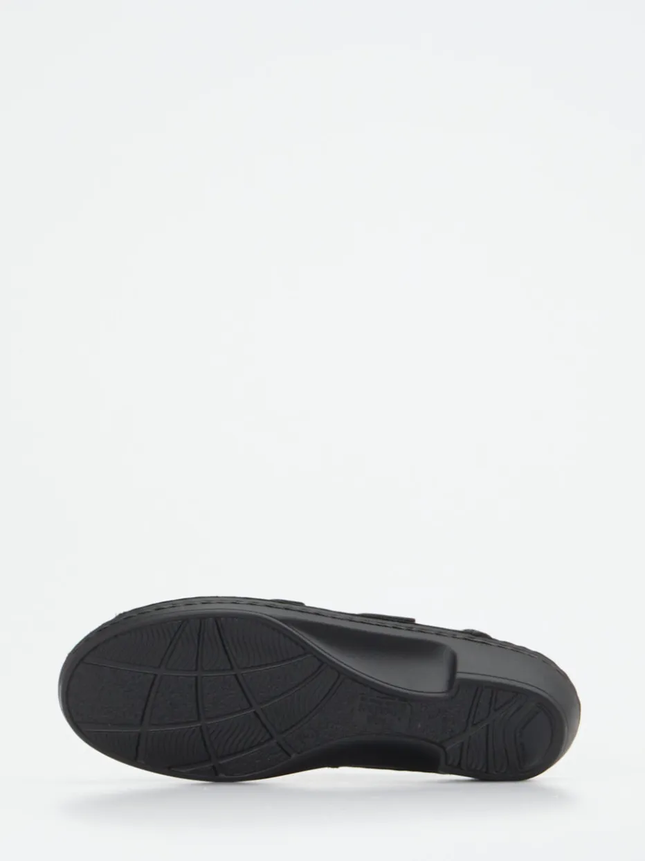 Diese komfortorientierte Sandale überzeugt mit geprägtem Leder, dreifacher Klettverstellung und austauschbarem Korkfußbett – funktional und elegant zugleich.