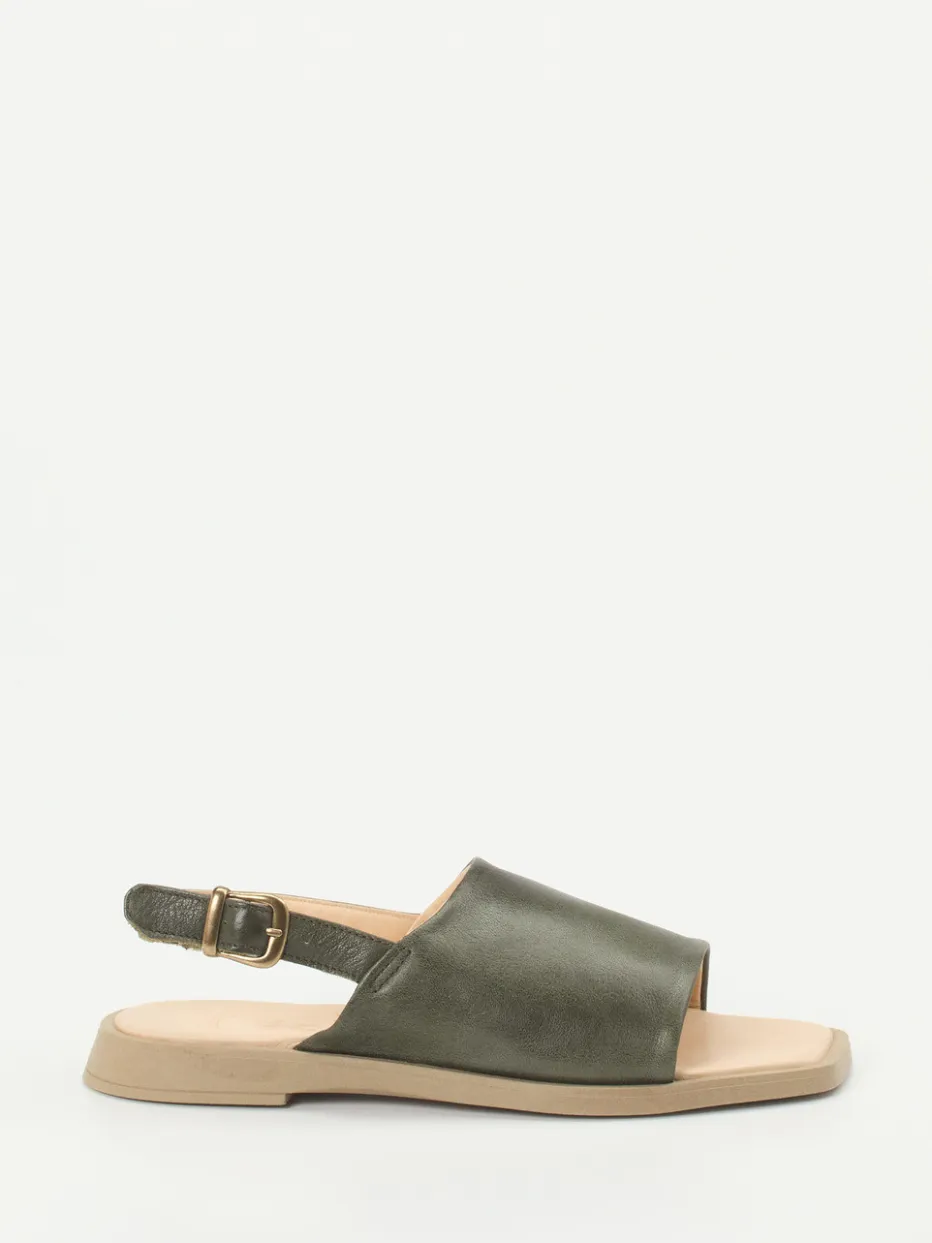 Unkomplizierte Eleganz für sonnige Tage.Die Marke Werner präsentiert mit dieser Sandale ein dezentes Essential für entspannte Sommermomente. Das vegetabil gegerbte Kalbleder besitzt eine glatte, matte Oberfläche und zeigt sich in einem tiefen Olivgrün. Der breite Spannriemen und der verstellbare Fersenriemen mit messingfarbener Schnalle sorgen für sicheren Halt und ein zurückhaltendes Design. Eine flache, flexible Gummisohle sowie das lederbezogene Fußbett auf Carré-Leisten bieten hohen Tragekomfort – ideal für Freizeit, City oder Urlaub. Elemente des „Quiet Luxury“-Trends verbinden sich mit natürlichem Flair. Ein sommerlicher Allrounder mit nachhaltiger Note – typisch Werner.