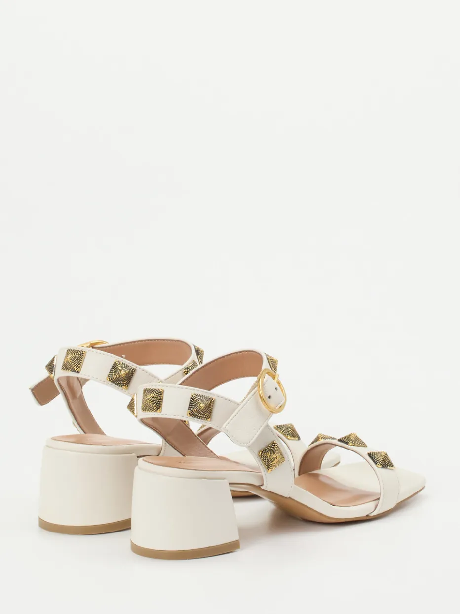 Ideal für festliche Anlässe oder stilvolle Alltagssituationen kombiniert das Modell hochwertiges, mattes Lammleder in cremigem Offwhite mit auffälligen, goldfarbenen Pyramidennieten. Der verstellbare Knöchelriemen mit goldener Dornschließe und der lederbezogene Blockabsatz sorgen für sicheren Sitz und angenehme Laufhöhe von 4,5 cm. Die offene Carréform und die geradlinige Silhouette setzen dezente Vintage-Akzente mit aktuellem Trendbezug. Kombinierbar mit leichten Sommerkleidern oder Metallic-Accessoires.