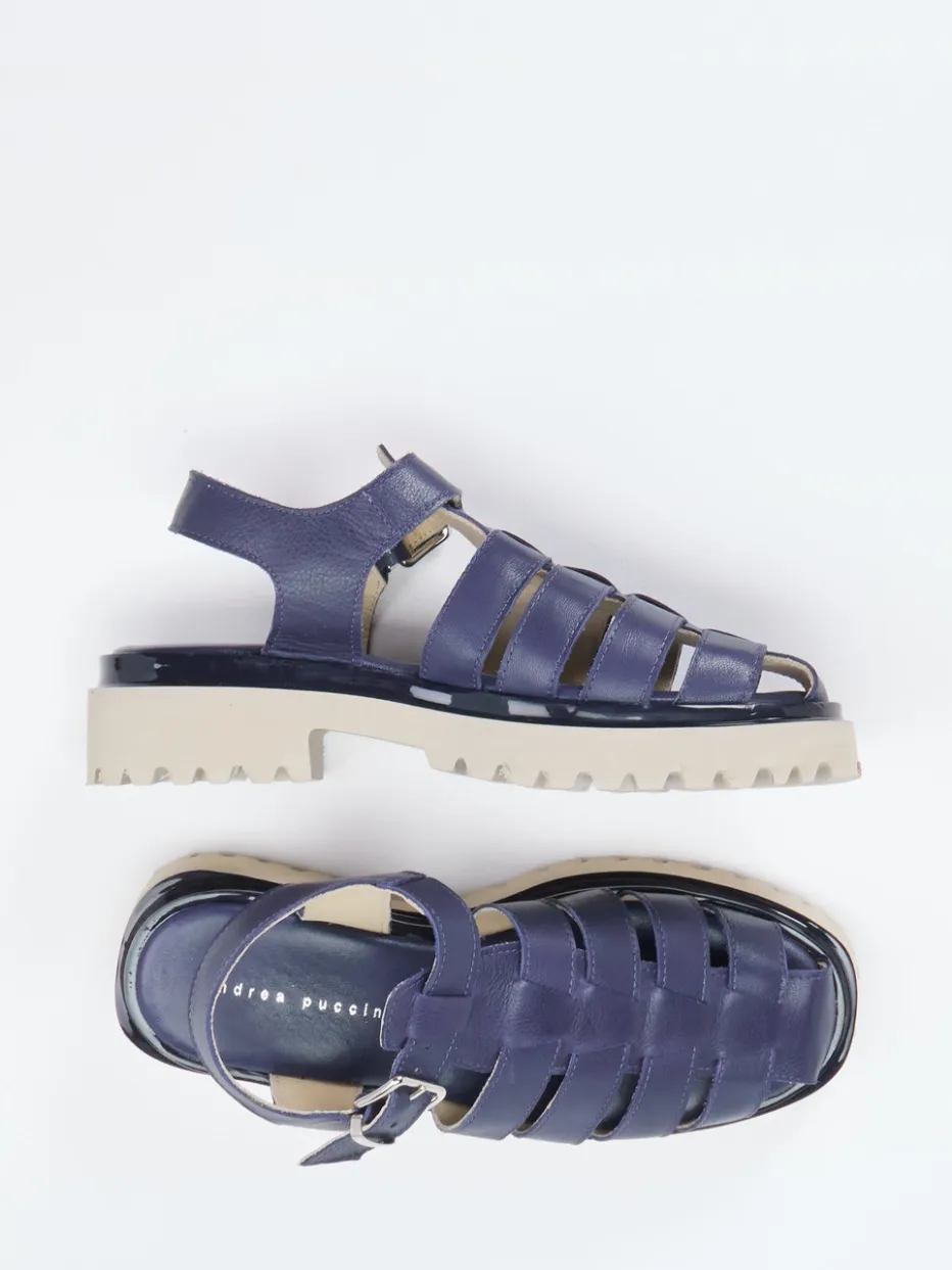 Fischerman-Design neu gedacht.Die Marke Andrea Puccini setzt bei dieser Damen-Sandale auf die ikonische Fischerman-Silhouette mit modernem Twist. Für warme Sommertage in der Stadt oder im Urlaub ist dieses Modell ideal. Gefertigt aus dunkelblauem Lammleder mit matter Optik zeigt es eine geschlossene Flechtstruktur mit offener Ferse und verstellbarer silberfarbener Schnalle. Die beige profilierte Plateausohle aus Leichtzell sorgt für Trittsicherheit, während das weich gepolsterte Fußbett Komfort garantiert. Streetwear-Elemente und Utility-Chic verbinden sich zu einem modischen Gesamtbild. Kombinierbar mit Leinenhose oder Oversized-Hemd für entspannte City-Looks. Klare Formensprache und hochwertige Materialien machen diesen Sommertrend besonders tragbar.