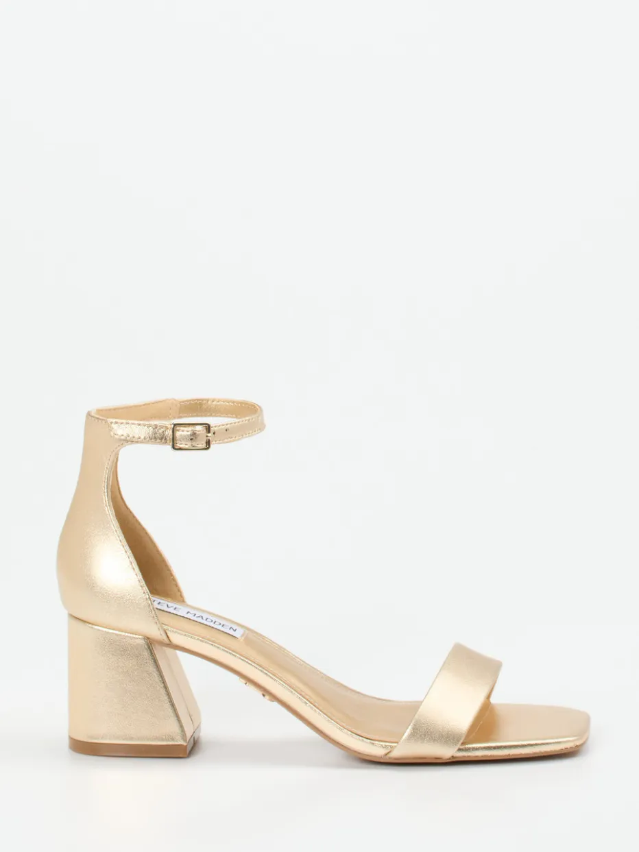 Diese goldfarbene Sandalette von Steve Madden kombiniert Metallicleder mit eckiger Formgebung und stabilem Blockabsatz – perfekt für moderne Abendlooks.