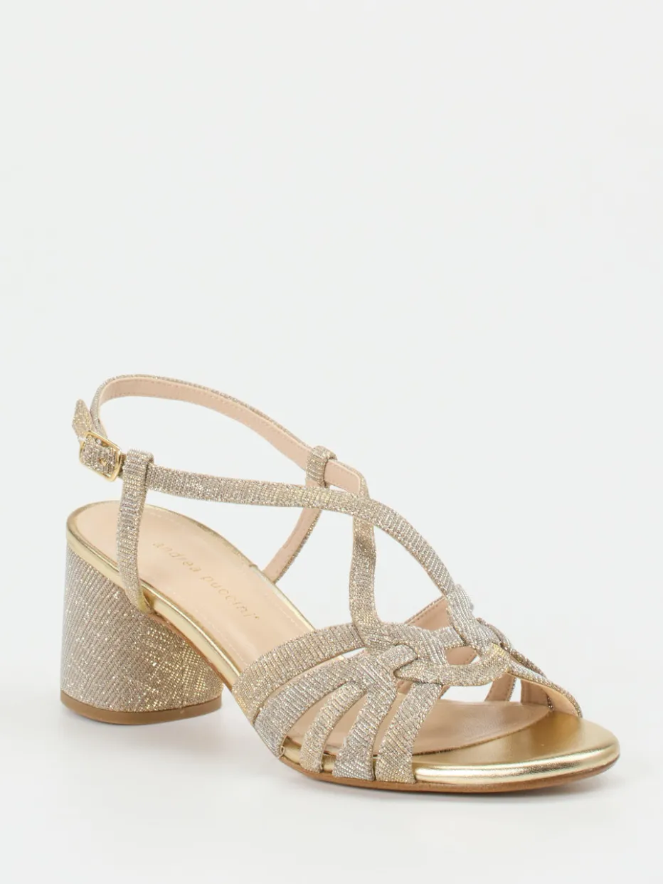 Glanzvoller Auftritt garantiert.Andrea Puccini präsentiert eine stilvolle Damen-Sandalette für besondere Anlässe. Der glitzerbesetzte Blockabsatz und das goldfarbene Metallicleder mit feinen Glitzerfäden setzen glamouröse Akzente bei festlichen Events oder eleganten Abenden. Mehrere schmale Riemen strukturieren die offen gehaltene Silhouette, während die Schnalle am Fesselriemen sicheren Halt bietet. Das glänzende Finish in Gold harmoniert mit dem femininen Design und passt perfekt zu Looks mit Metallic-Clutch oder dezenten Accessoires. Der komfortable Kunststoffsohle mit leichter Polsterung sorgt für angenehmes Tragegefühl. Ein Schuh mit strahlender Eleganz und modischer Präzision.