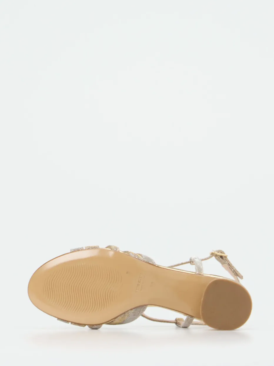Diese eleganten Abendsandaletten mit glitzerndem Finish vereinen stilvolle Vintage-Ästhetik mit modernen Metallic-Akzenten – ideal für festliche Anlässe.