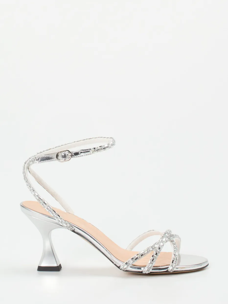 Die filigrane Silhouette mit strassbesetzten Riemen und der glänzende Metallic-Look machen diese Sandalette zur stilvollen Wahl für elegante Anlässe mit Glamour-Faktor.
