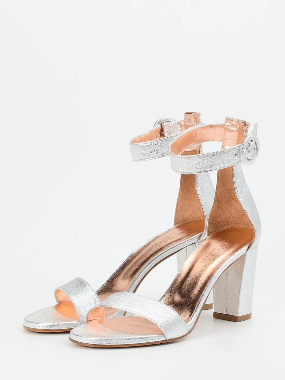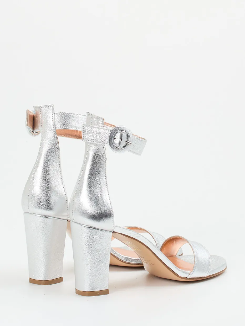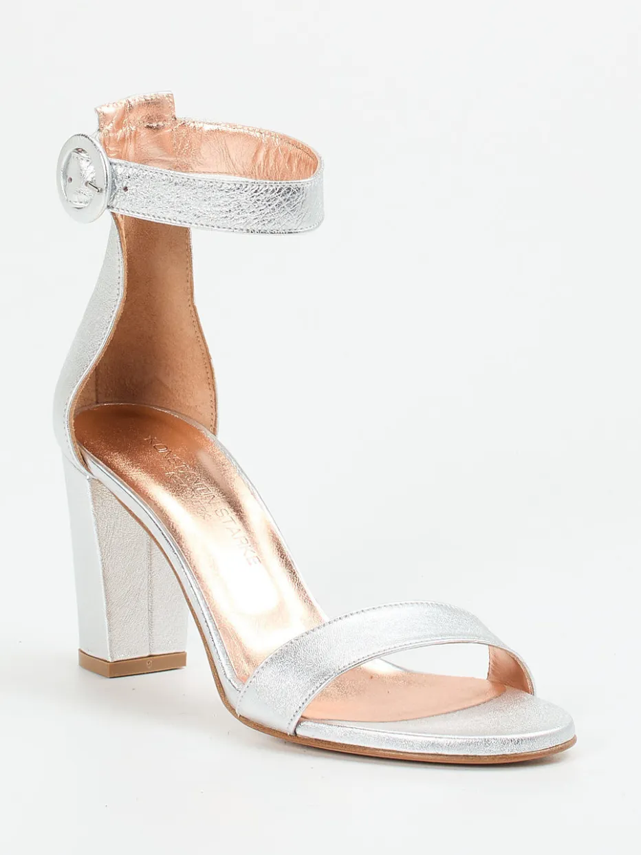 Egal ob Cocktailabend oder Sommerempfang – das silberfarbene Metallicleder mit glänzendem Finish verleiht diesem Modell einen ausdrucksstarken Charakter. Die offene Form mit blockigem, bezogenem Absatz bietet Stabilität und Eleganz zugleich, während die große Rundschnalle am Knöchelriemen für ein markantes Detail sorgt. Innen sorgt feines Kalblederfutter für angenehmen Tragekomfort. Inspiriert vom Retro Glam-Look, greift die Sandalette den Metallic-Trend der Saison gekonnt auf. Passt ideal zu fließenden Stoffen oder Metallic-Accessoires.