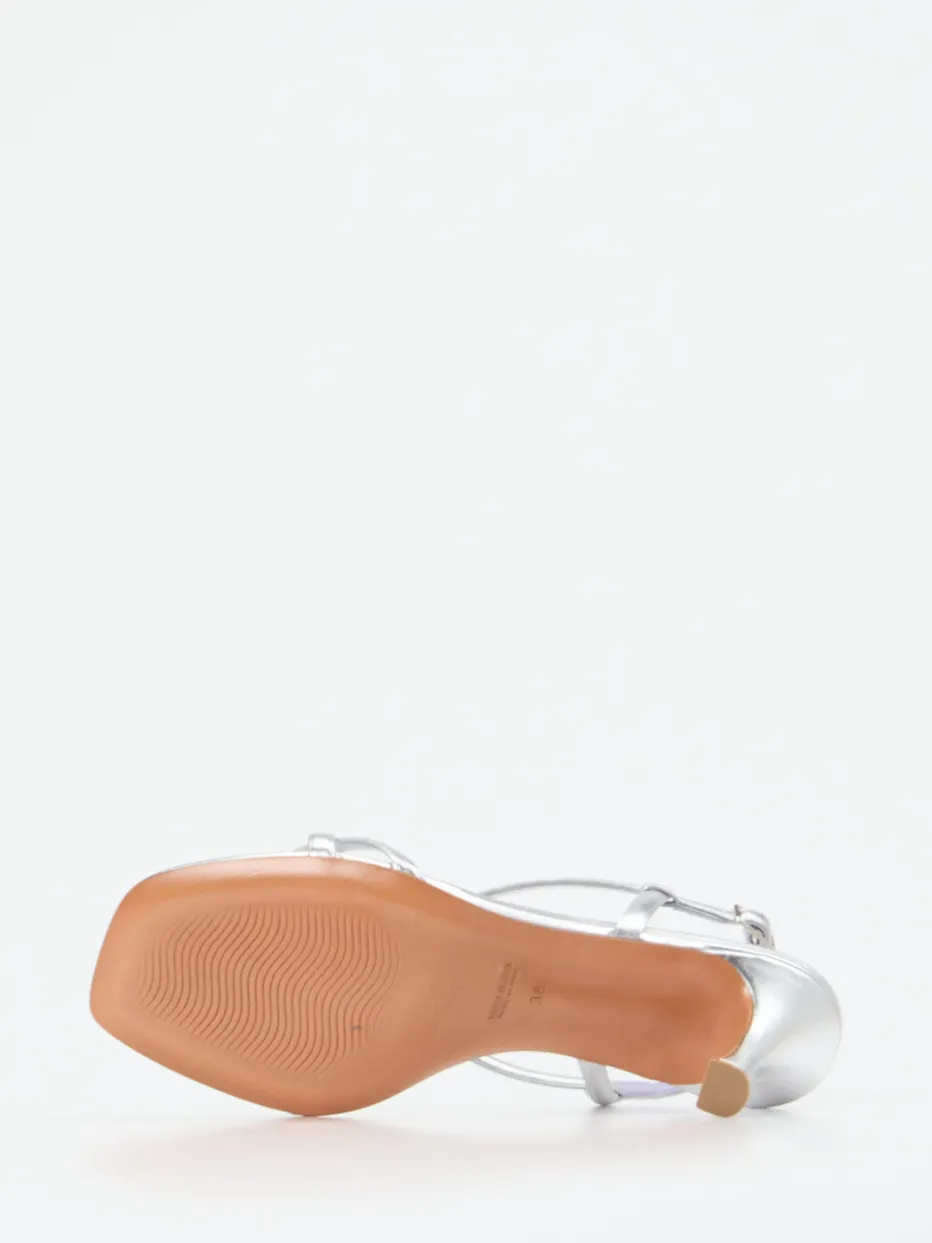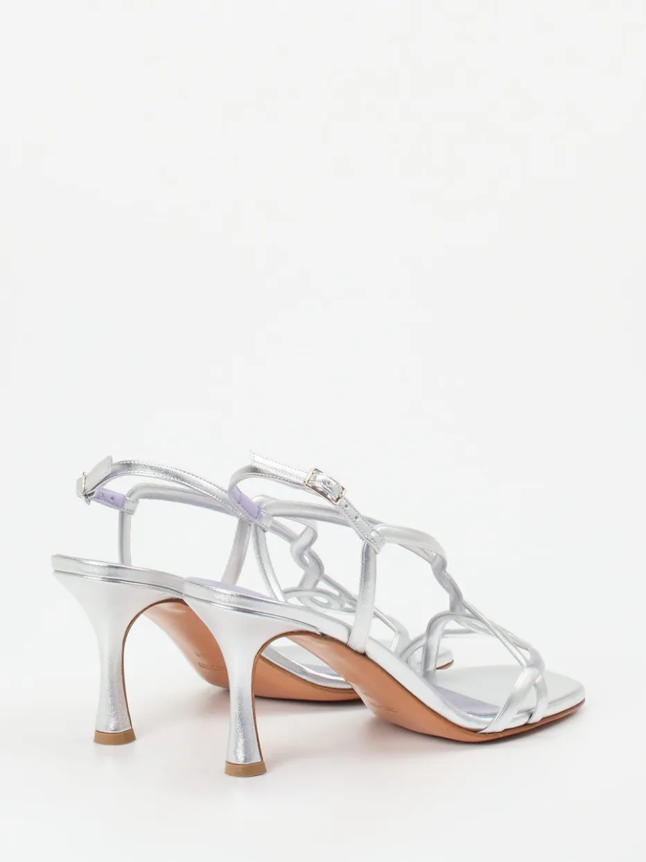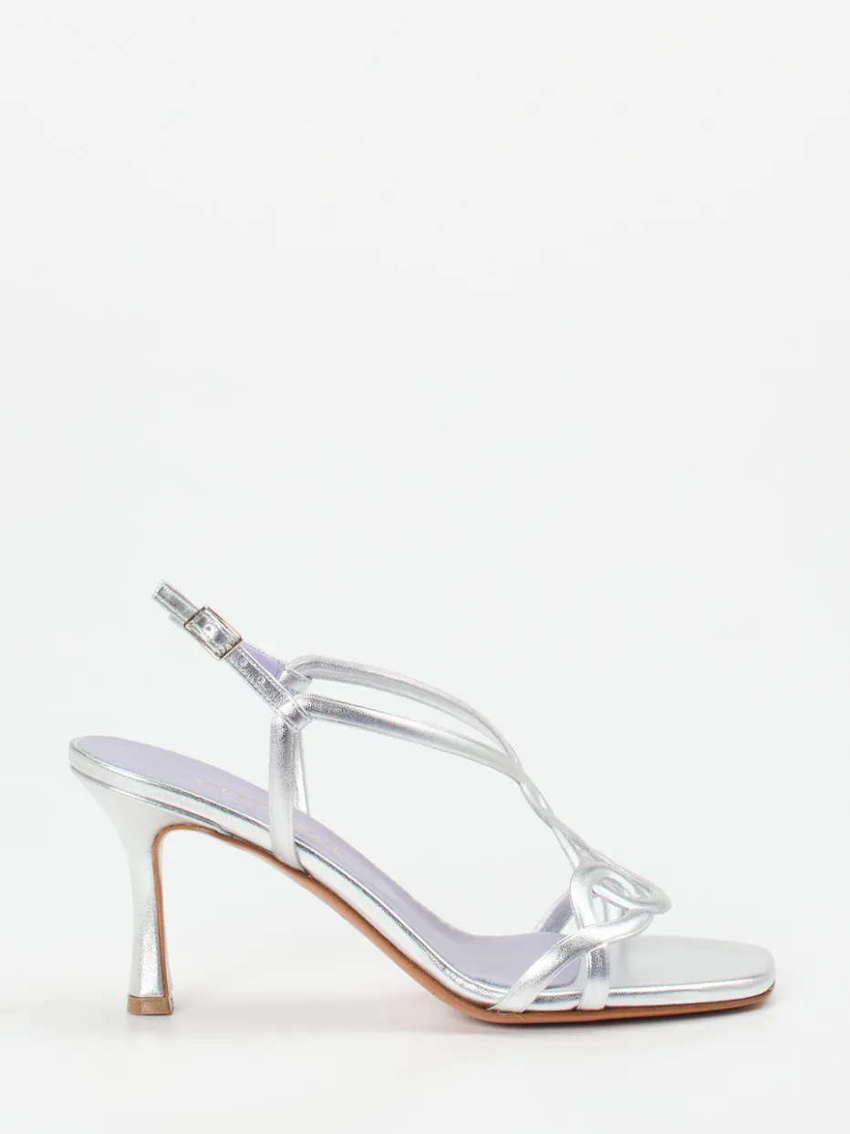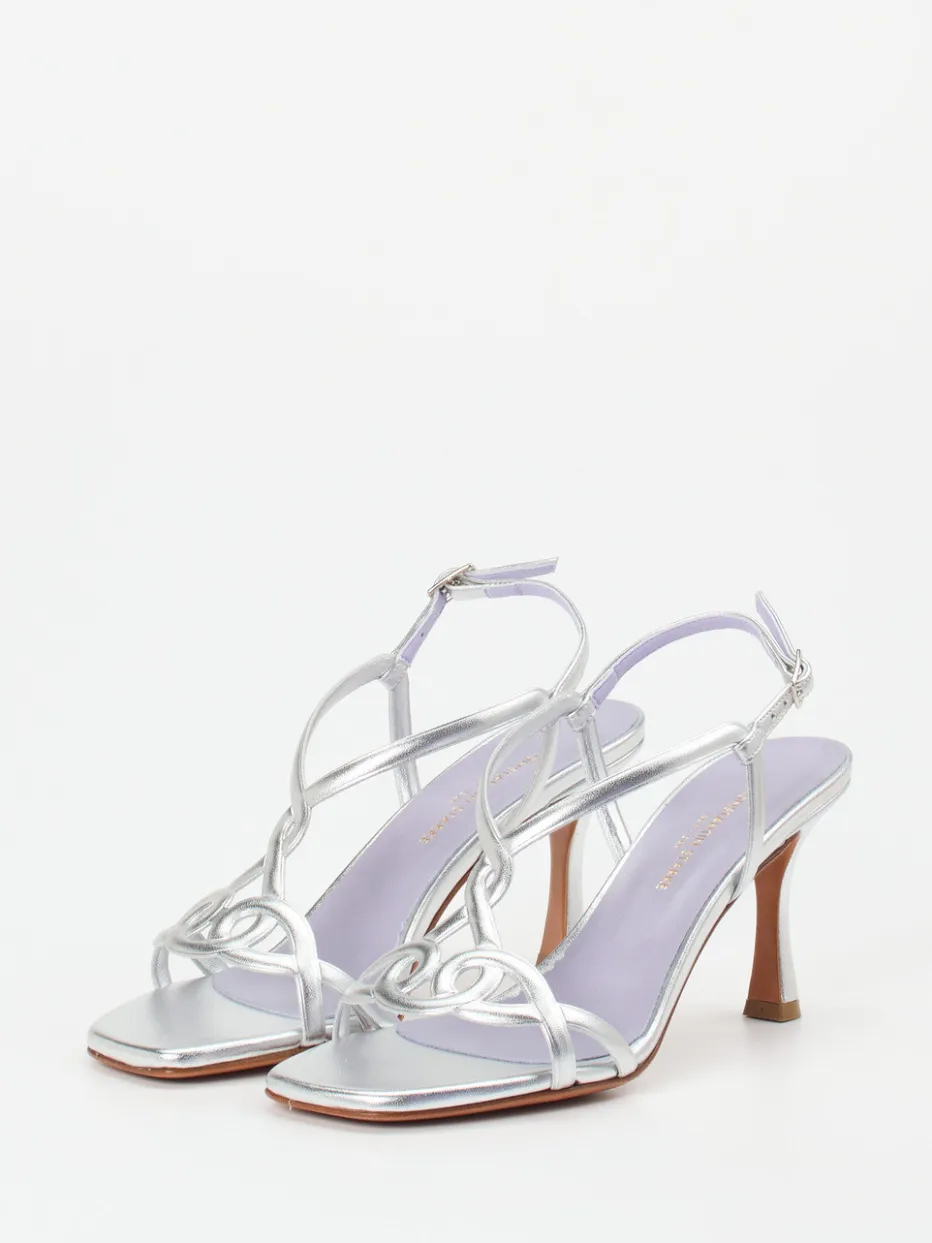 Mit metallischem Glanz, filigranen Ornamentriemen und skulpturalem Absatz vereint diese Sandalette moderne Eleganz mit aktuellen Designtrends.