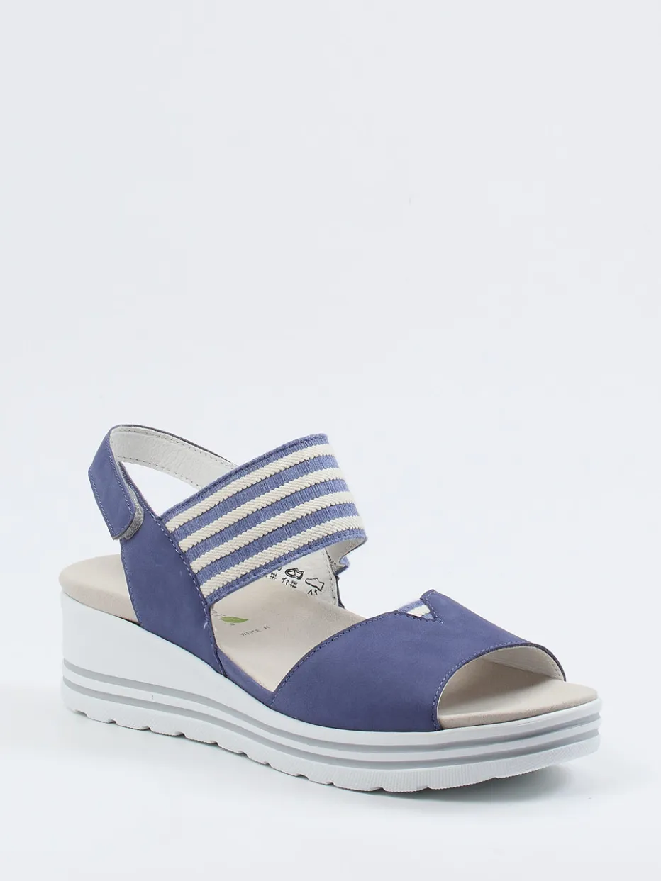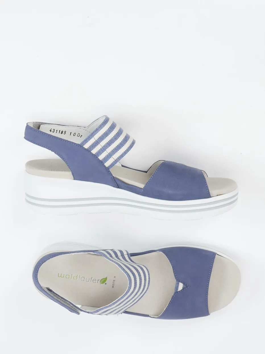 Leichtigkeit trifft auf Komfort.Waldläufer präsentiert mit dieser Komfort-Sandalette eine feminine Lösung für entspannte Sommertage. Die Kombination aus samtig angeschliffenem Nubukleder in Jeansblau und elastischem Ristband mit Streifenmuster sorgt für angenehmen Halt und ein luftiges Tragegefühl. Die offene Silhouette wirkt modern und harmoniert mit der weißen Keilsohle, die dank grauer Streifendetails dezent akzentuiert ist. Der praktische Klettverschluss an der Ferse unterstützt eine individuelle Passform, während das wechselbare Fußbett für orthopädische Einlagen geeignet ist. Dieser Look passt hervorragend zu lässigen Sommerhosen oder Leinenblusen. Ein durchdachter Sommerschuh mit Komfortweite H – typisch Waldläufer.