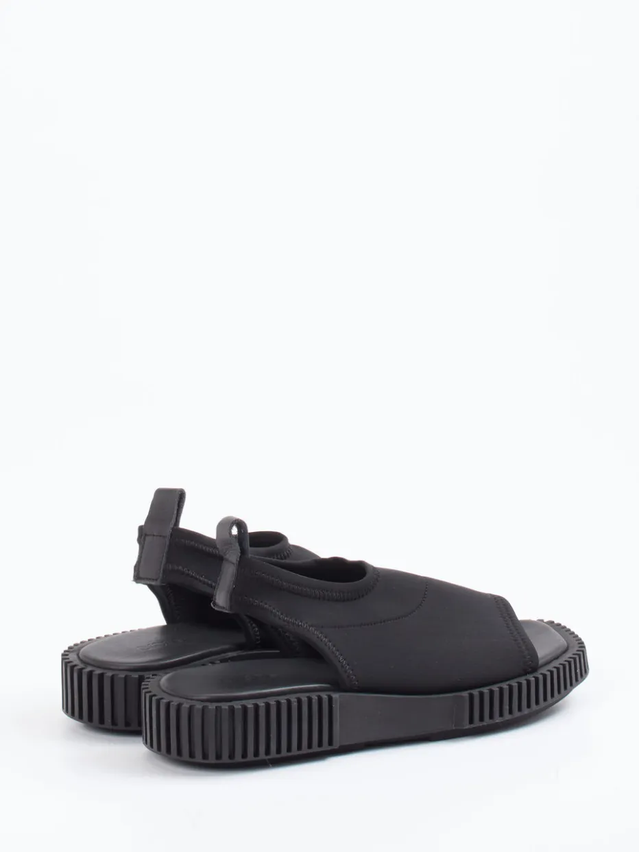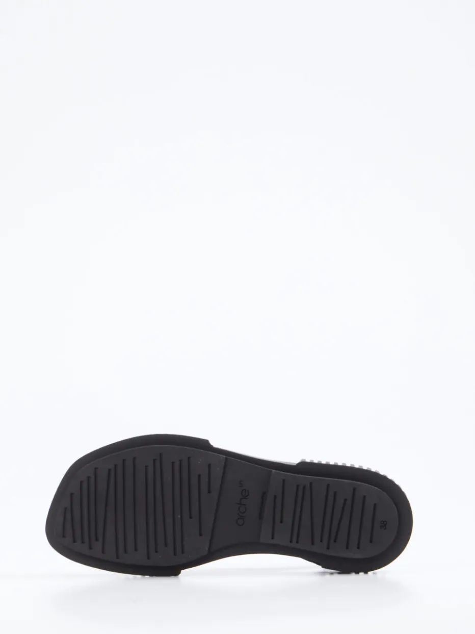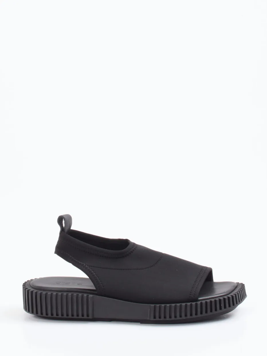 Minimalistisch trifft funktional.Die Marke Arche präsentiert eine moderne Damen-Sandalette mit sportivem Charakter. Für sommerliche Stadtabenteuer oder Urlaubsflair bietet diese Sandale sicheren Halt und angenehmen Komfort. Das schwarze Stretchmaterial schmiegt sich passgenau an den Fuß und erinnert in seiner Beschaffenheit an elastisches Neopren – samtig-matt und anschmiegsam. Die geschlossen gearbeitete Front unterstützt Stabilität, während Ferse und Zehen offen gestaltet sind. Auffallend ist die profilierte Gummisohle mit Ton-in-Ton-Struktur und moderner Plateaoform, ergänzt durch die dezente Zuglasche am Fersenriemen. Ein klarer Look im Zeichen von Minimalismus und Techno-Attitüde. Typischer Arche-Komfort in urban inspirierter Formensprache.