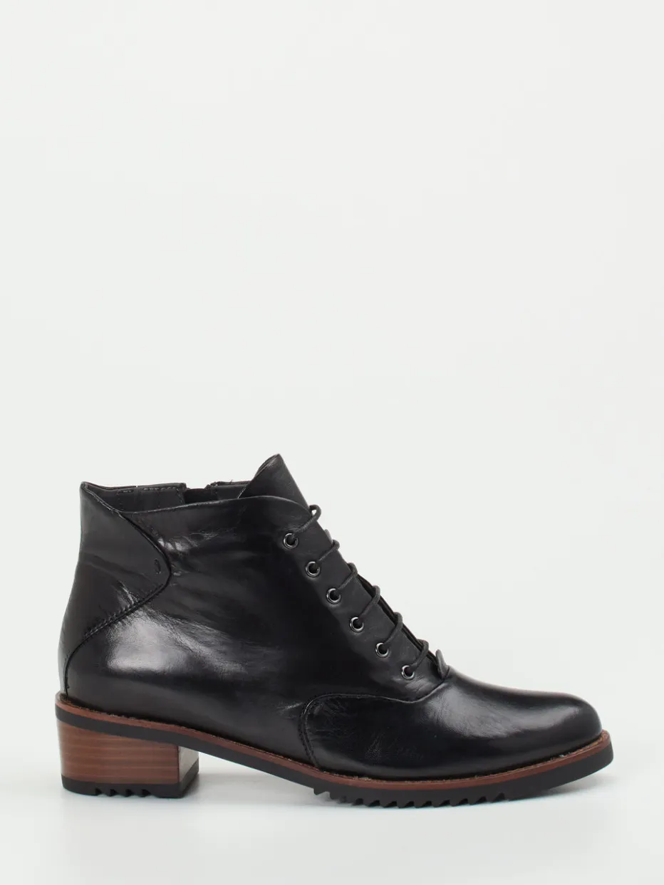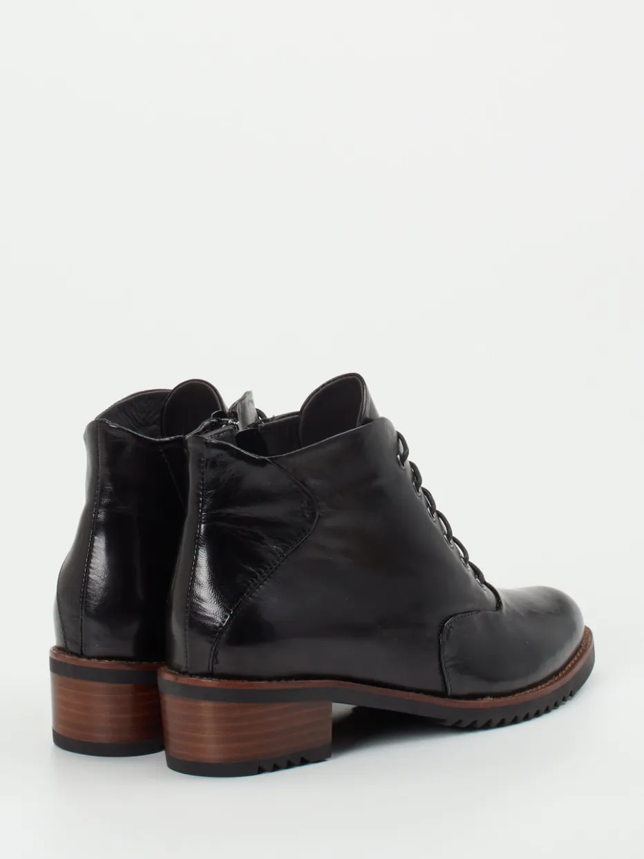 Modernes Understatement mit Komfort.Everybody präsentiert klassische Damen-Stiefeletten mit Schnürung und Reißverschluss – gefertigt aus hochwertigem, glänzendem Kalbleder. Die tiefschwarzen Boots verbinden eine leicht taillierte, knöchelhohe Silhouette mit charakterstarken Design-Details wie brauner Kontrastsohle, markanter Rahmennaht und Metallösen. Das warme Textilfutter sorgt für angenehme Isolation an kühlen Tagen, während die profilierte Gummisohle Trittsicherheit garantiert. Der 4 cm hohe Blockabsatz unterstreicht den klaren Heritage-Charakter mit modernem Utility-Twist. Passend zu urbanen Herbst-Looks oder reduziertem Business-Styling. Zeitlose Formensprache trifft funktionale Eleganz – Qualität von Everybody.
