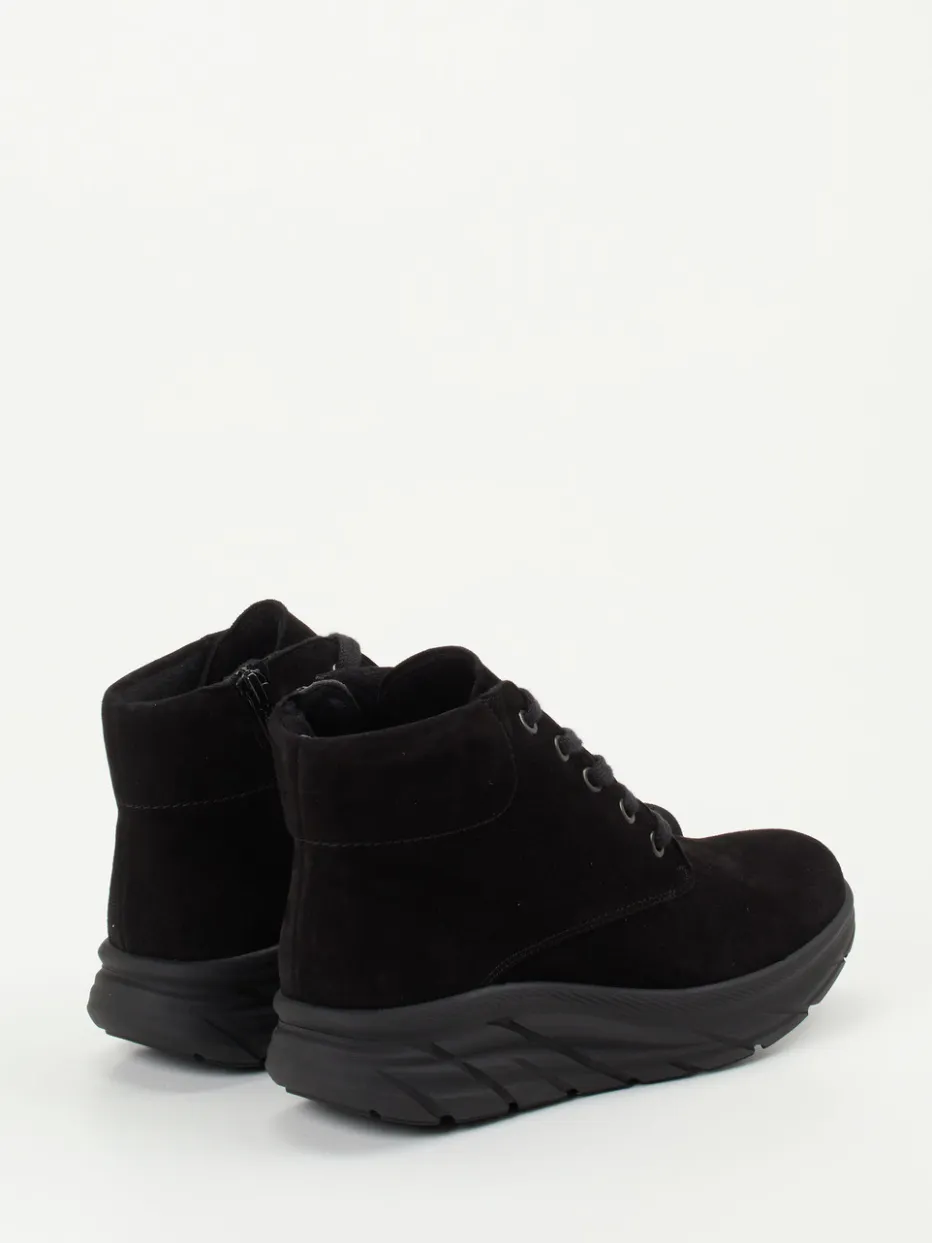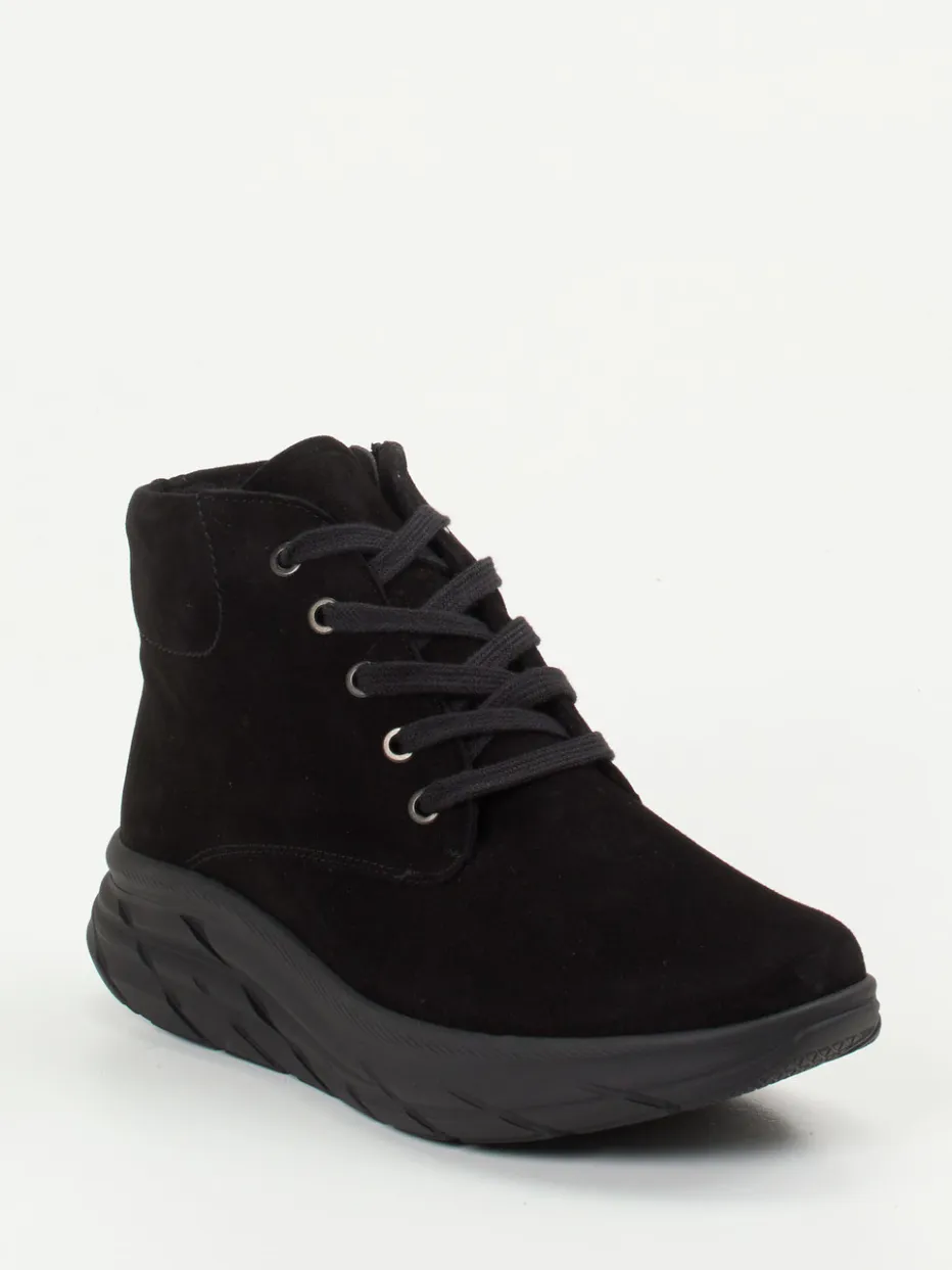 Puristischer Komfort trifft auf urbanen Chic.Die Marke Semler präsentiert robuste Damen-Stiefeletten in sportlich-lässigem Design. Ideal für kühle Tage in der Stadt oder gemütliche Spaziergänge – diese Schnür-Boots bestehen aus samtig angeschliffenem, schwarzem Veloursleder. Die knöchelhohe Form wird durch eine Ton-in-Ton-Schnürung und einen seitlichen Reißverschluss ergänzt, der den Einstieg erleichtert. Eine leichte, voluminöse Profilsohle sorgt für rutschfesten Halt und setzt einen modernen Akzent. Innen verwöhnt ein weiches Textilfutter, das zuverlässig warm hält. Das herausnehmbare Fußbett bietet Raum für individuelle Einlagen. Ein rundum durchdachtes Design mit Bequemschuh-Komfort im minimalistischen Look von Semler.