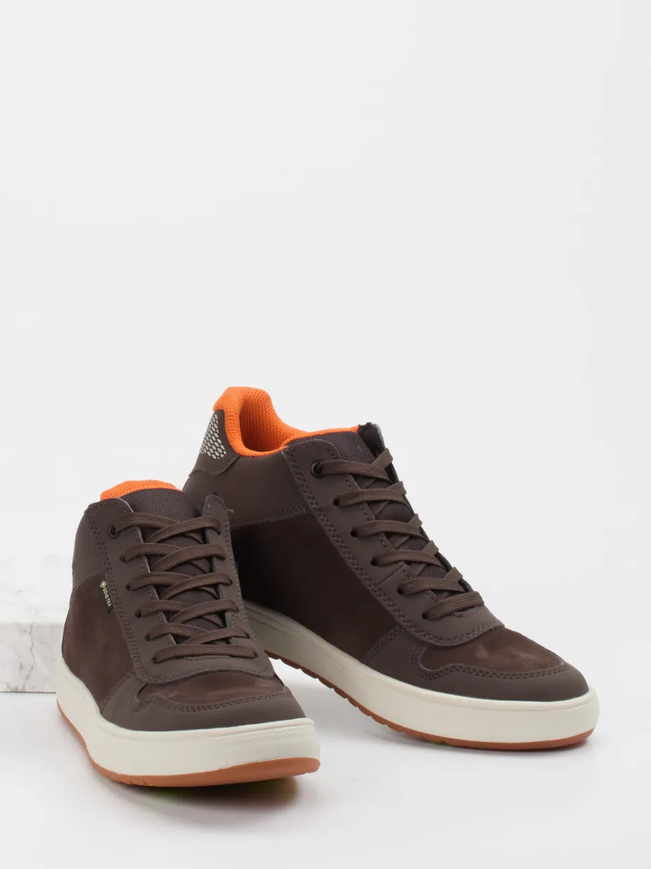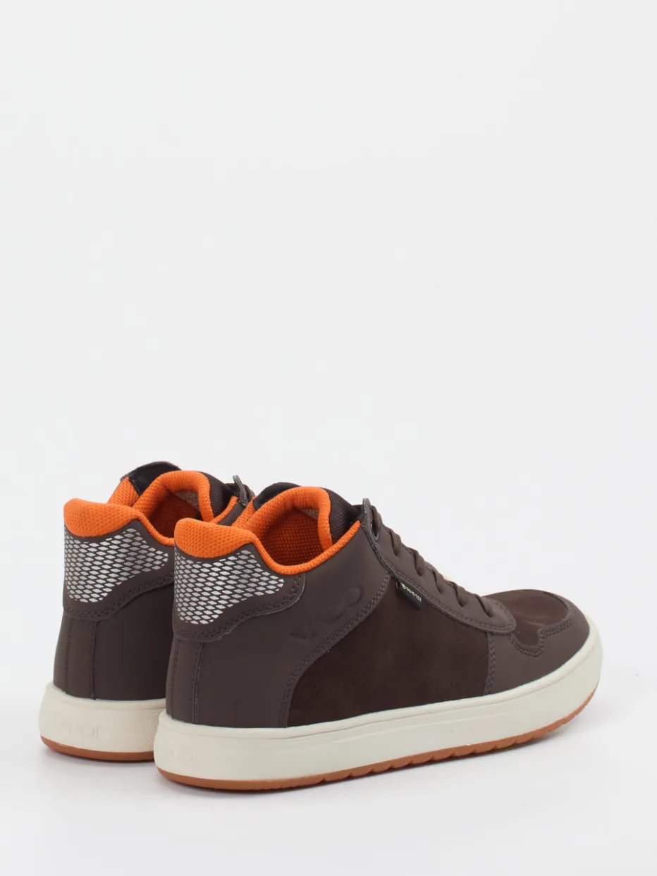 Ideal für aktive Tage im Freien: Das Modell vereint robustes Veloursleder mit einer samtig-matten Oberfläche und ist dank integrierter GORE-TEX-Membran atmungsaktiv sowie wasserabweisend. Die schokobraune Basisfarbe wird durch ein orangefarbenes Innenfutter und reflektierende Fersenelemente kontrastreich ergänzt. Ein gepolsterter Schaft sorgt für Tragekomfort, während die profilierte Gummisohle zuverlässigen Halt gibt – ob auf dem Schulweg oder beim Waldspaziergang. Inspiriert von Streetwear und Outdoor-Funktion, passt der Look zu funktionalen Kinderjacken und Funktionshosen.