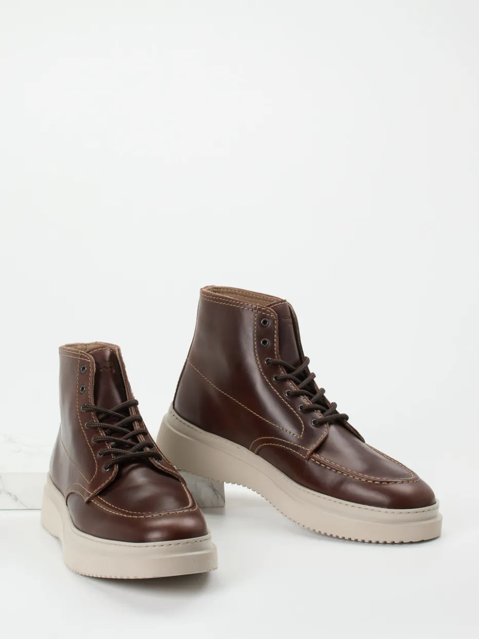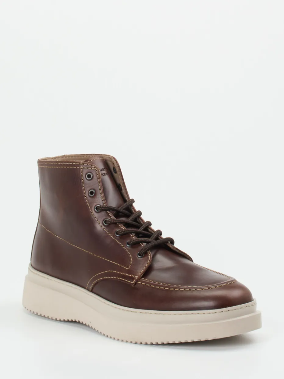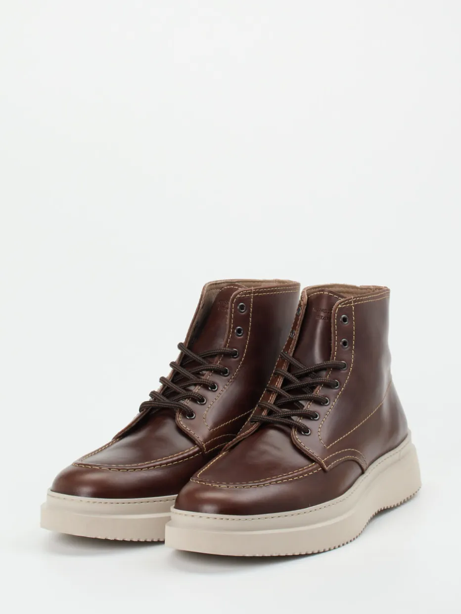 Authentischer Look trifft moderne Leichtigkeit.Konstantin Starke präsentiert mit diesen Herren-Schnürboots ein vielseitiges Modell für Alltag und Business. Das kastanienbraune Fettleder mit leichtem Glanz und beiger Kontrastnaht verleiht klassische Workwear-Ästhetik mit urbanem Anspruch. Die klare, hochgeschlossene Form wird ergänzt durch eine robuste Schnürung und eine profilierte Chunky-Sohle aus Gummi mit EXTRALIGHT-Technologie – ideal für lange Tage. Das ledergefütterte Innenleben inkl. Wechsel-Fußbett sorgt für ergonomischen Komfort. Stilistisch passen die Boots zu cleanem Denim und Naturtönen. Hochwertige Fertigung und maskulines Design stehen für Konstantin Starkes kompromisslosen Qualitätsanspruch.