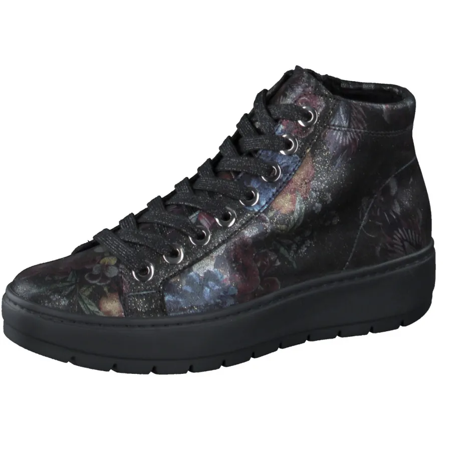 Schwarzgrundiges, geprägtes Leder mit buntem Blumenmuster und schimmerndem Glanz sorgt für einen starken Auftritt. Die knöchelhohe Silhouette mit seitlichem Reißverschluss und breiter Schnürung in silberfarbenen Ösen ist zugleich funktional und modisch. Eine luftgepolsterte PU-Sohle federt weich ab und lässt sich auch mit Einlagen tragen. Inspiriert von den Trends Dark Floral und Metallic Accents der Saison Herbst/Winter.