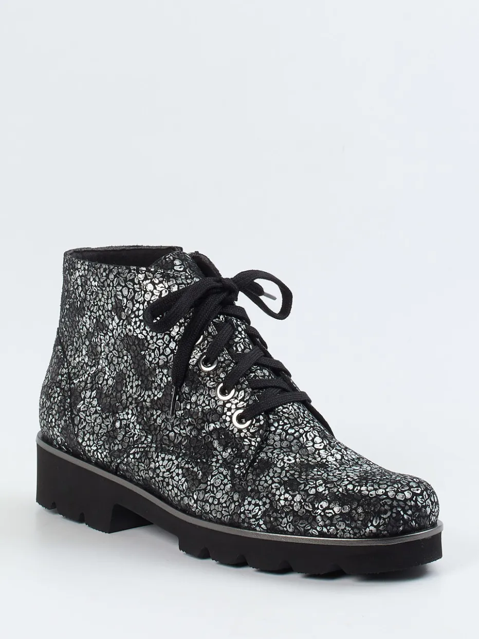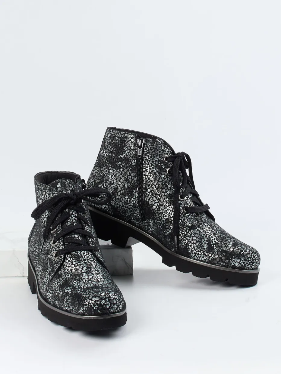 Statement-Stil für urbane Szenen.Die Marke Christian Dietz steht bei diesen Schnürboots für trendorientiertes Design mit hohem Tragekomfort. Ideal für vielseitige Freizeitlooks: Das schwarze, geprägte Leder mit silberfarbenem, floralem Metallic-Muster bringt auffälligen Glanz ins Spiel. Die knöchelhohe, kompakt gehaltene Silhouette wird durch eine klassische Schnürung und einen seitlichen Reißverschluss ergänzt. Die extraleichte, profilierte Gummisohle unterstützt angenehmes Gehen in der City. Ein herausnehmbares Fußbett macht das Modell auch für Einlagen tragbar. Ein expressives Highlight für trendorientierte Streetwear mit bequemer Ausstattung.
