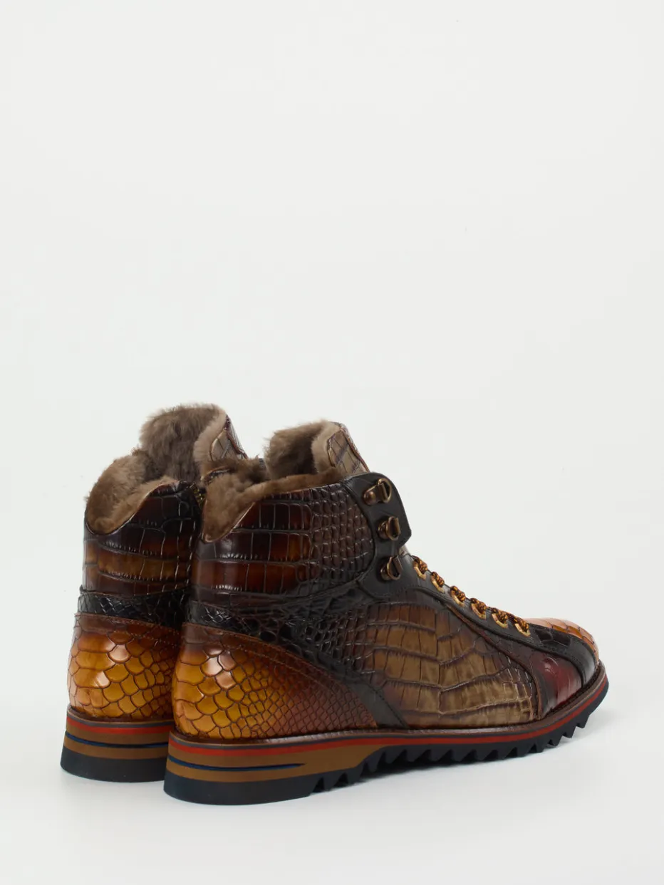 Mit Kroko-Prägung, goldfarbenen Details und warmem Lammfellfutter verbinden diese Boots auffällige Ästhetik mit funktionalem Komfort.