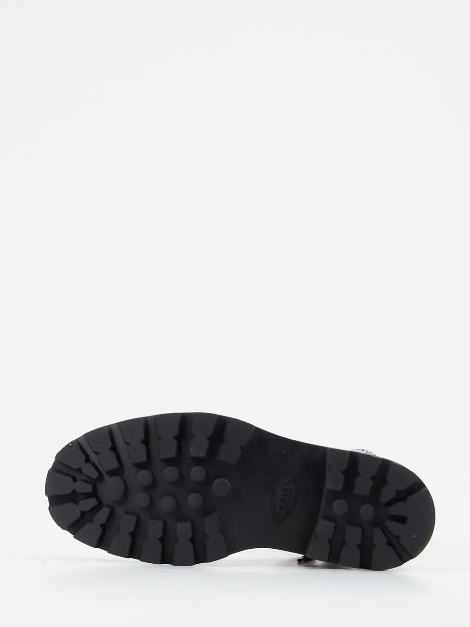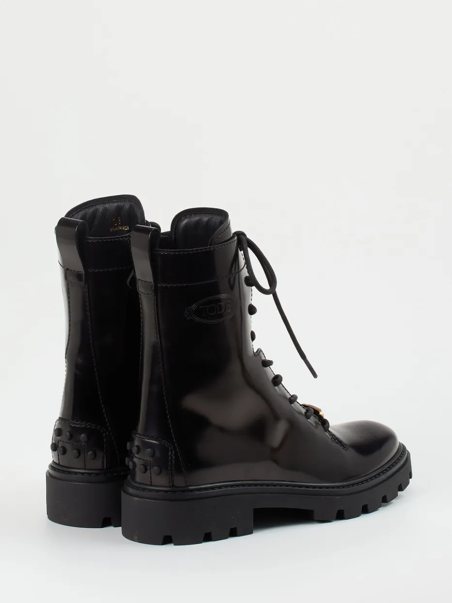 Subtiles Statement mit glänzendem Akzent.Tod’s präsentiert mit diesen Damen-Schnürboots eine elegante Form urbaner Lässigkeit. Ideal für den täglichen Einsatz in der kalten Saison bieten die schwarzen Stiefeletten aus hochwertigem Hochglanzleder eine gelungene Balance aus Minimalismus und markanter Präsenz. Die robuste, knöchelhohe Silhouette mit Schnürung und Reißverschluss sorgt für festen Sitz, während goldfarbene Details und das dezente Markenlogo an der Seite stilvolle Akzente setzen. Die ausgeprägte Gummisohle mit Profil verspricht Traktion auf nassen Wegen und unterstreicht den Chunky-Look – inspiriert von Streetstyle und dem Trend ‚Quiet Luxury‘. In Kombination mit schwarzem Wollmantel vollendet sie einen urban-femininen Look. Hochwertige Verarbeitung und dezente Markenästhetik stehen im Fokus dieses Modells von Tod’s.