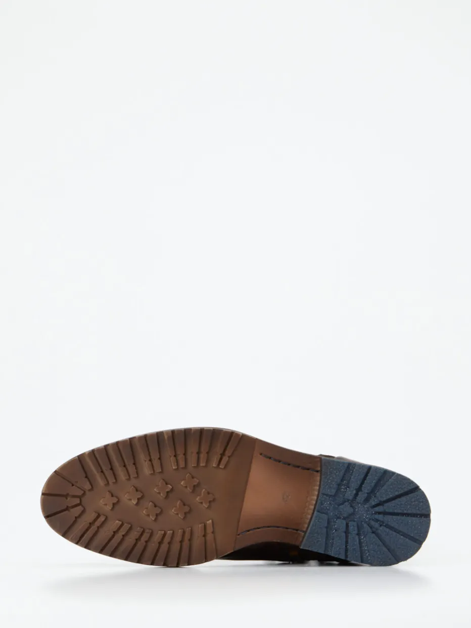 Bei wechselhaften Bedingungen sorgt das dunkelbraune Kalbleder mit samtigem Veloursbesatz und strukturierten Textileinsätzen für Eleganz und Widerstandsfähigkeit. Der knöchelhohe Schaft wird durch Ton-in-Ton-Nähte sowie bronzefarbene Metallösen akzentuiert, während der seitliche Reißverschluss einen leichten Einstieg bietet. Die rutschfeste Gummisohle mit Profil eignet sich ideal für urbane Wege – vom Büro bis zum Wochenendspaziergang. Der Look passt besonders gut zu Wollhosen oder Jeans in gedeckten Farben.