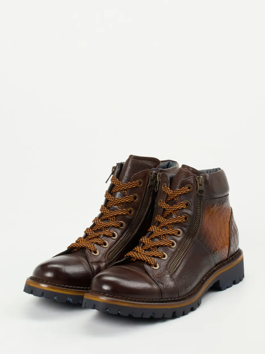 Stilsicher durch Wind und Wetter.Konstantin Starke präsentiert hier modische Herren-Schnürboots mit durchdachtem Outdoor-Charakter. Für herbstliche City-Touren oder entspannte Wochenenden im Freien punkten diese knöchelhohen Boots mit dunkelbraunem Kalbleder und glänzender Krokoprägung im Fersenbereich. Die Kombination aus seitlichen Reißverschlüssen und zweifarbigen Schnürbändern erleichtert den Einstieg und setzt stilvolle Akzente. Ein weich gepolsterter Schaft und Innenfutter aus feinem Leder sorgen für angenehmen Tragekomfort, während die robuste Gummisohle mit blauem Profil sicheren Halt garantiert. Vintage-Referenzen verbinden sich mit moderner Streetwear und machen dieses Modell zu einem spannenden Struktur-Mix. Ein gehobener Casual-Schuh mit markanter Optik und funktionalem Kern.