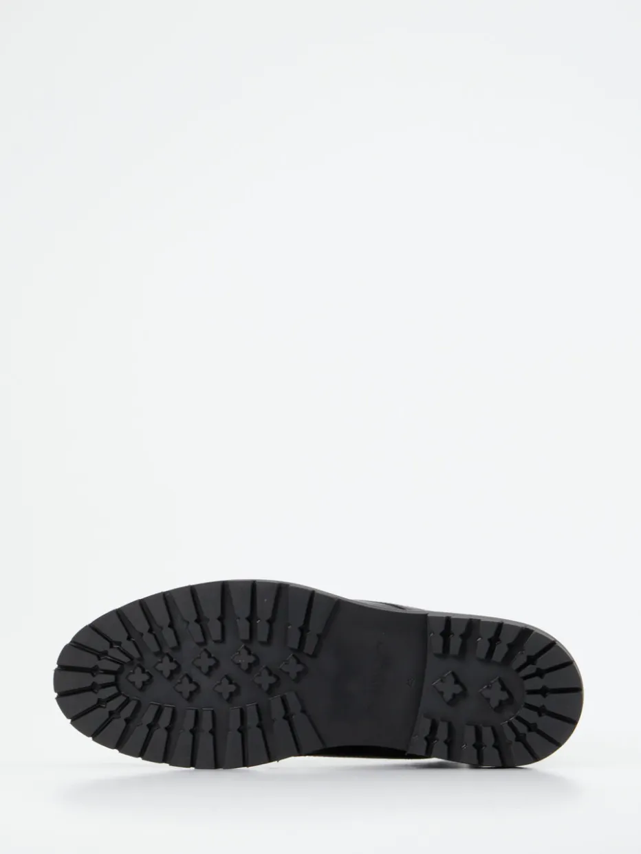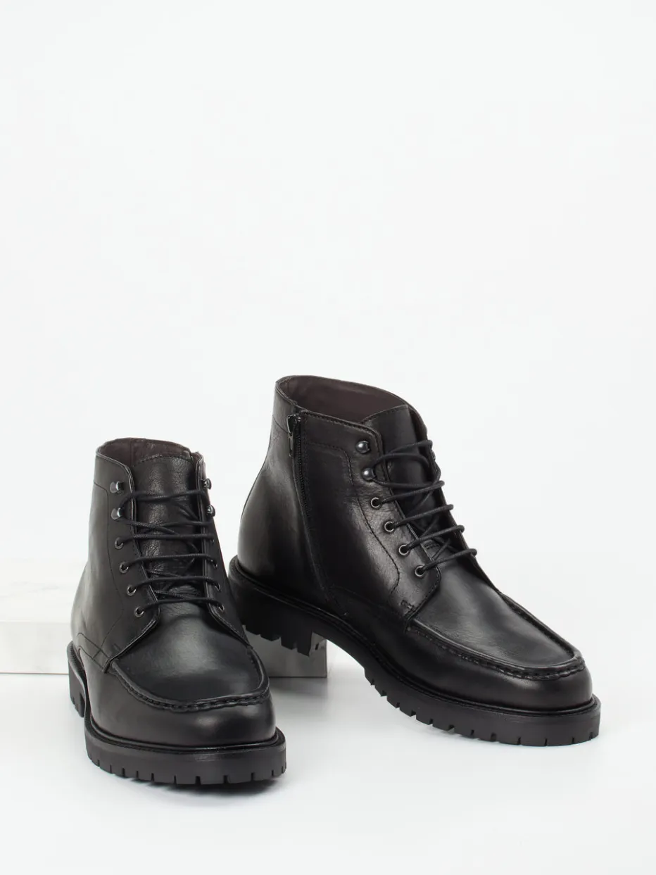Für Arbeitsweg oder Freizeitweg bestens geeignet: Das schwarze Kalbleder mit matter Oberfläche verleiht den Boots eine dezente Eleganz. Die kompakte Form mit Derbybögen, tonal abgestimmten Nähten und schwarz gehaltenen Metallösen wirkt klar und robust. Eine rutschfeste Gummisohle unterstützt den aktuellen Heavy-Sole-Trend und sorgt für sicheren Tritt. Innen bietet Kalblederfutter mit gepolstertem Fußbett angenehmen Komfort. Die Kombination aus Schnürung und Reißverschluss erleichtert den Einstieg. Stilistisch besonders stark zu dunklen Wollhosen oder Lederaccessoires.
