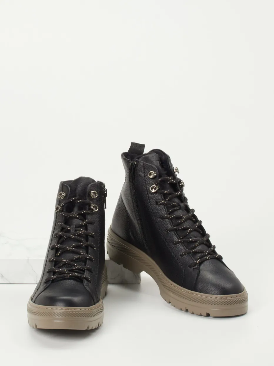Warmer Komfort trifft Utility-Design.Paul Green stellt mit diesen Damen-Schnürboots eine warme und robuste Option für Herbst und Winter vor. Ideal für kalte Wegstrecken durch Stadt oder Natur: Das schwarze Kalbleder mit genarbter Oberfläche sorgt für Widerstandsfähigkeit und Langlebigkeit. Innen hält ein weiches schwarzes Fellfutter angenehm warm. Ein seitlicher Reißverschluss ergänzt die zweifarbige Schnürung mit silberfarbenen Metallösen. Die profilierte taupefarbene Gummisohle steht für guten Halt auf glattem oder unebenem Untergrund. Die knöchelhohe Silhouette passt zur aktuellen Gorpcore-Ästhetik und lässt sich gut mit Leggings oder Cargohosen kombinieren. Zuverlässigkeit und Komfort – in markentypischer Premium-Qualität.